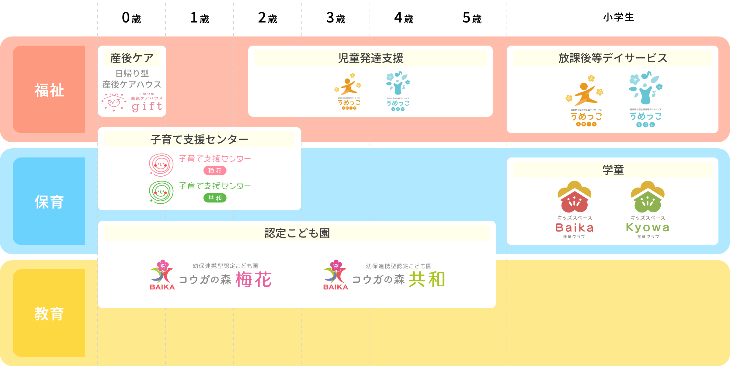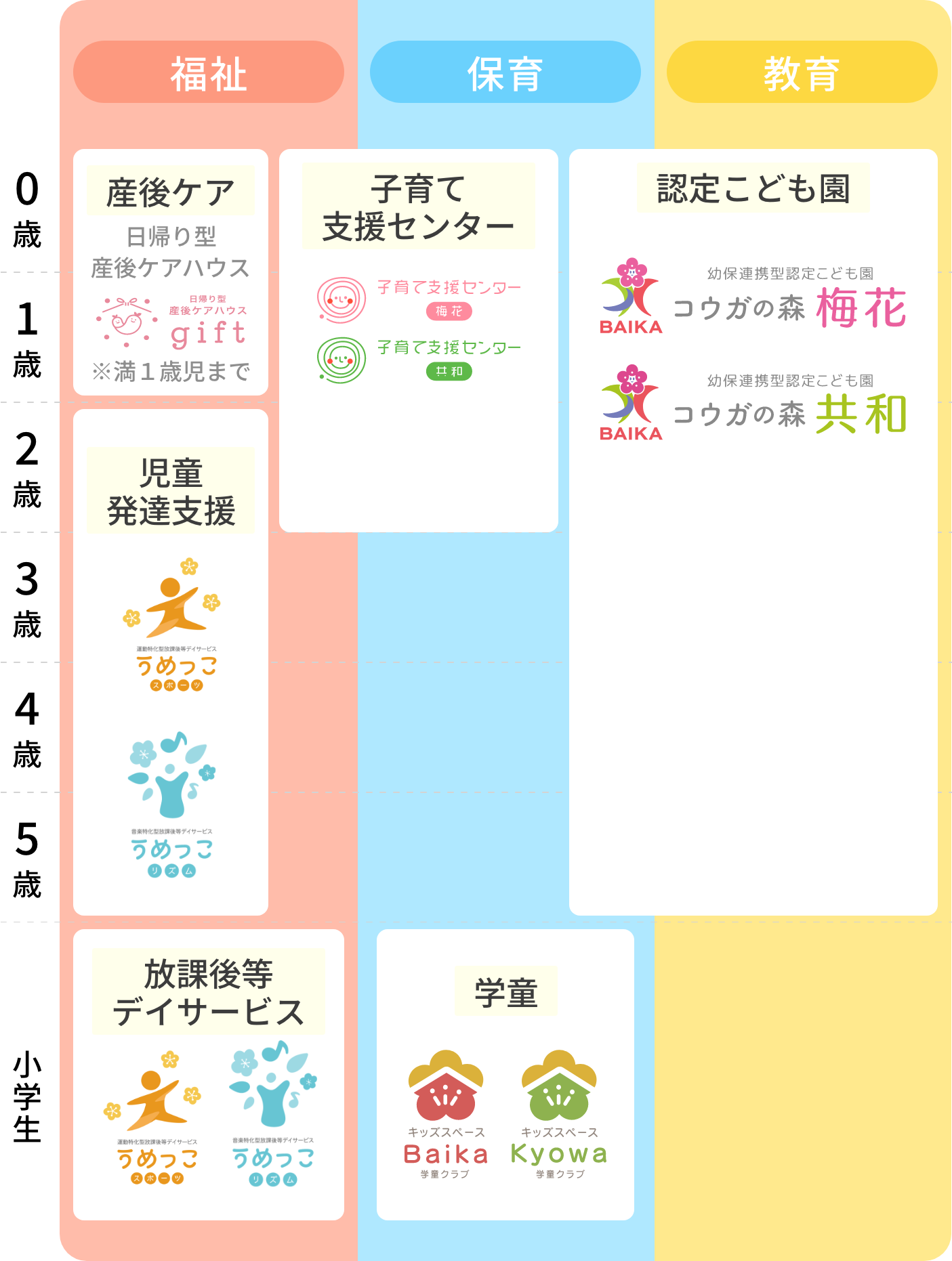 梅花福祉会では、子育てのあらゆる時期に寄り添い、切れ目のない支援をおこなっています。