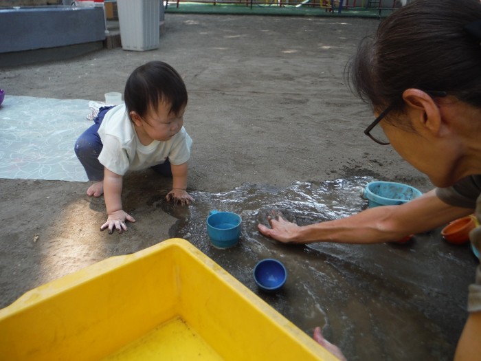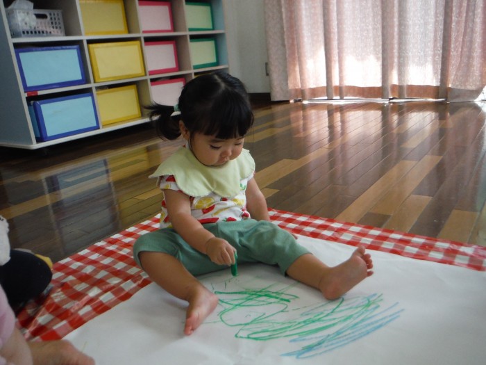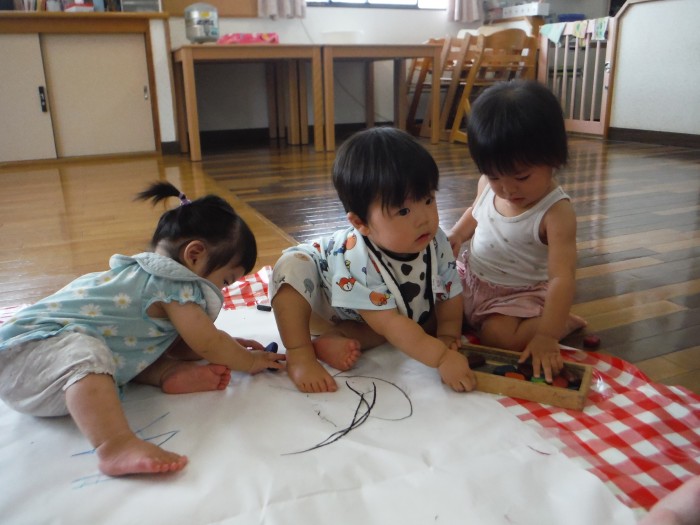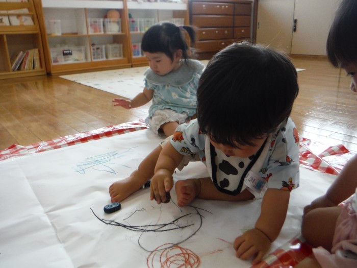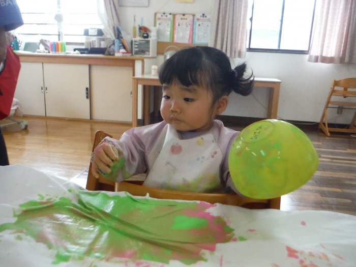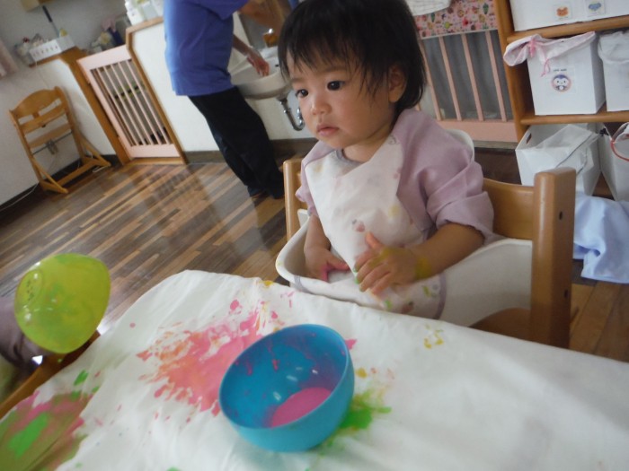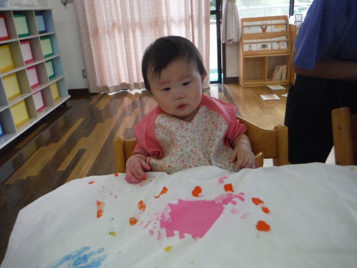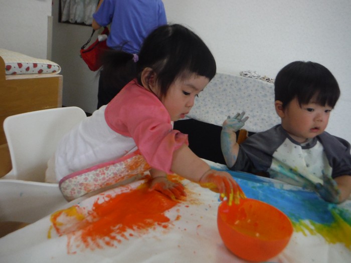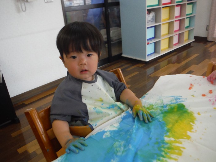 絵の具遊びでは、手がカラフルに!シーツの上にヌリヌリしました!