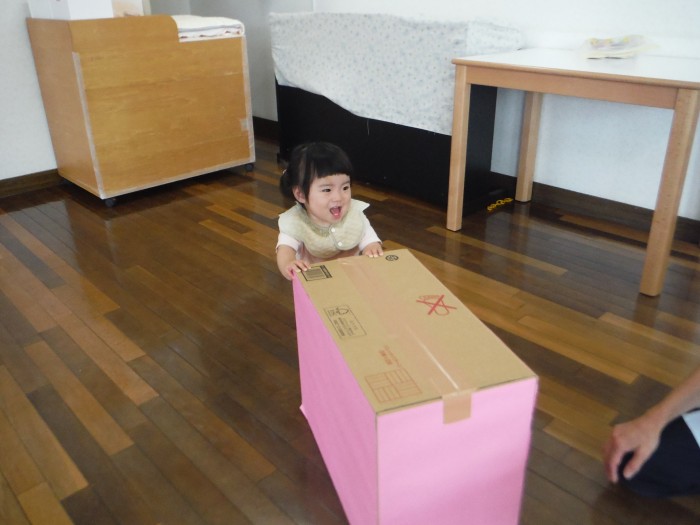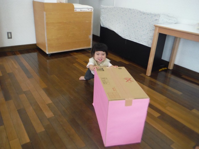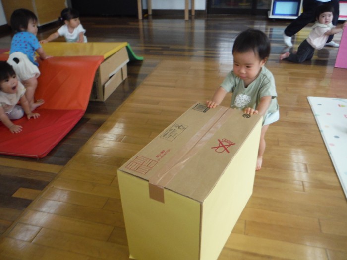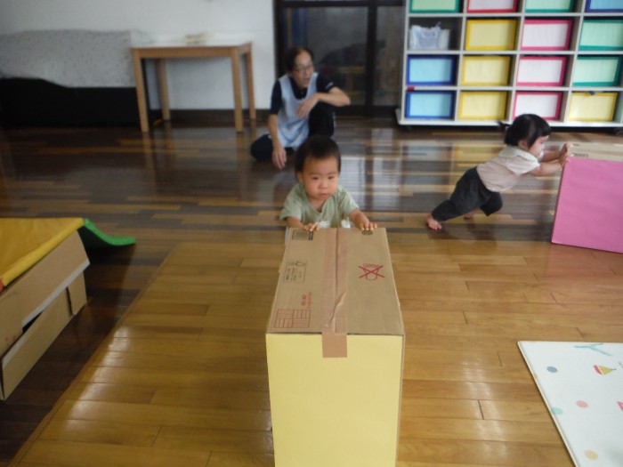 マットお山を登ったり、重りの入った段ボールを押して親子競技の練習だ!!