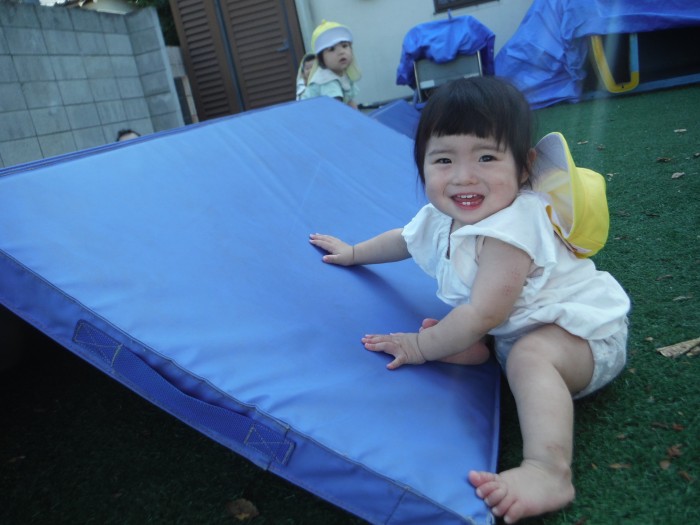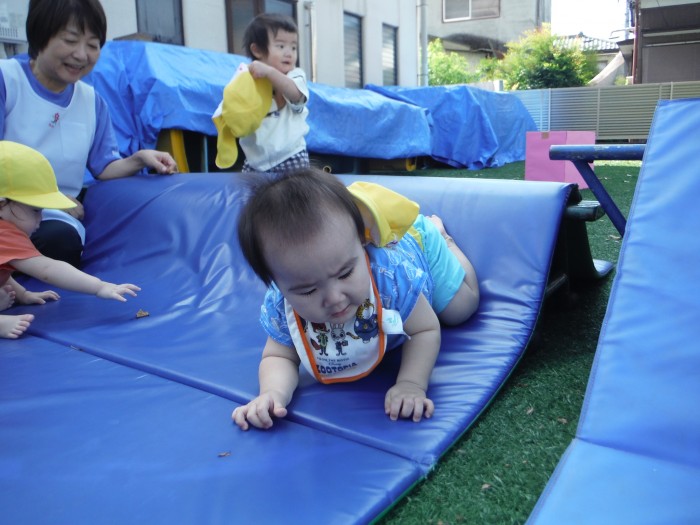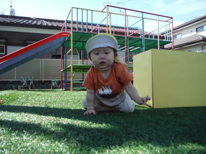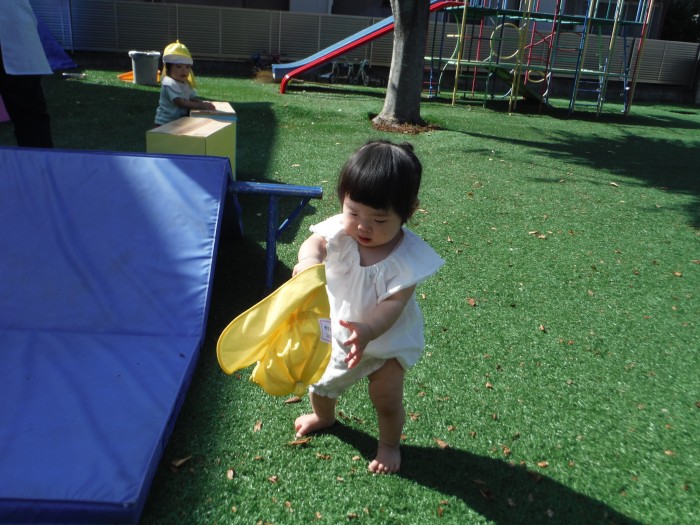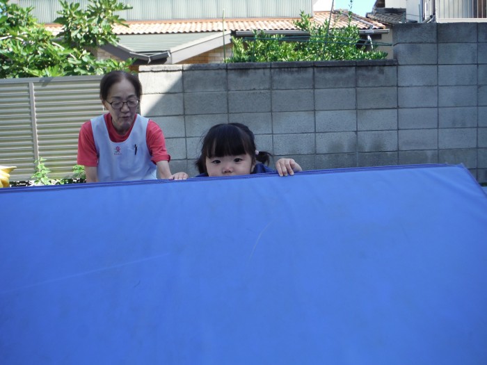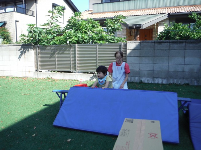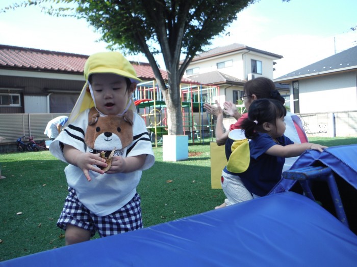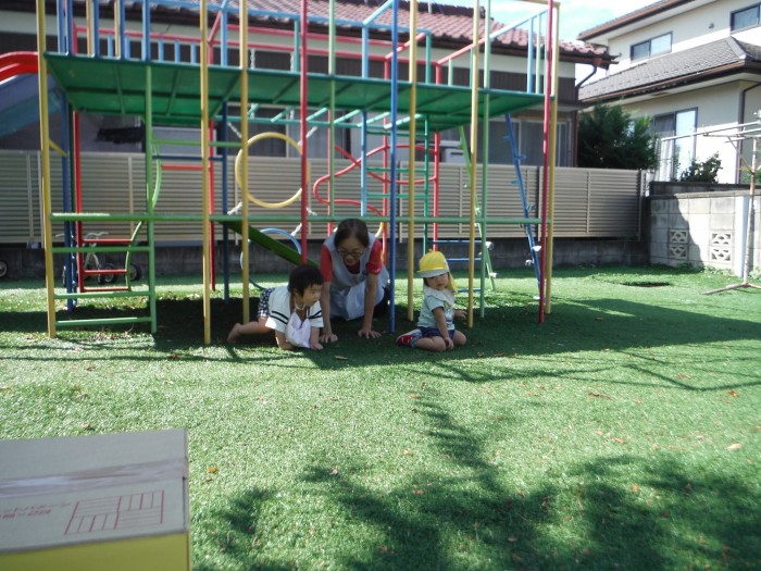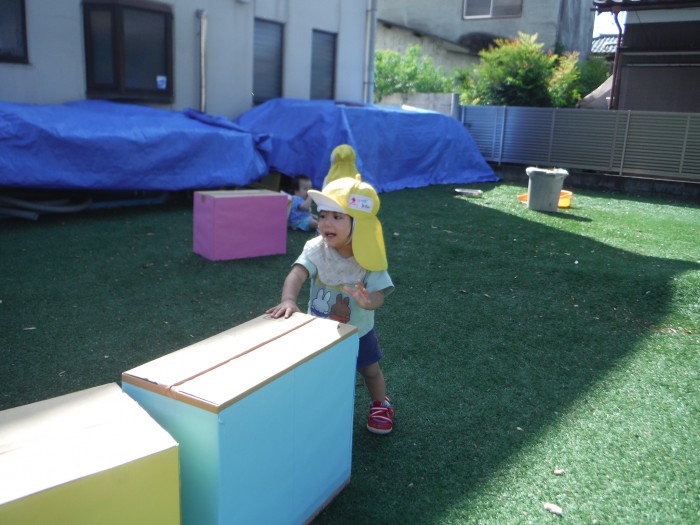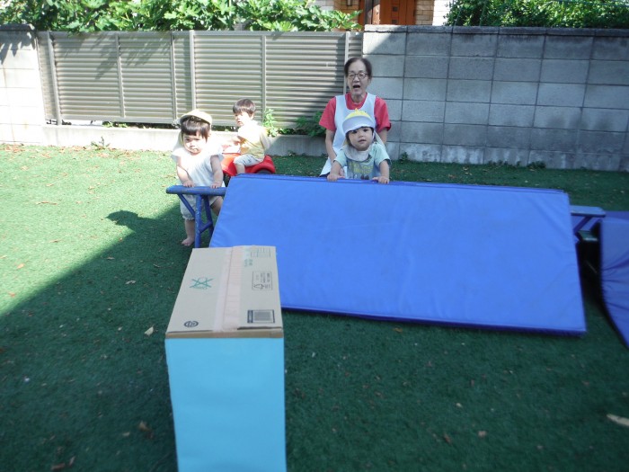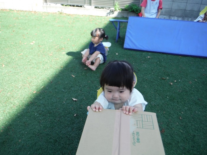 お外遊びの様子②運動会の練習でお山登りや段ボールをどすこいどすこい♪