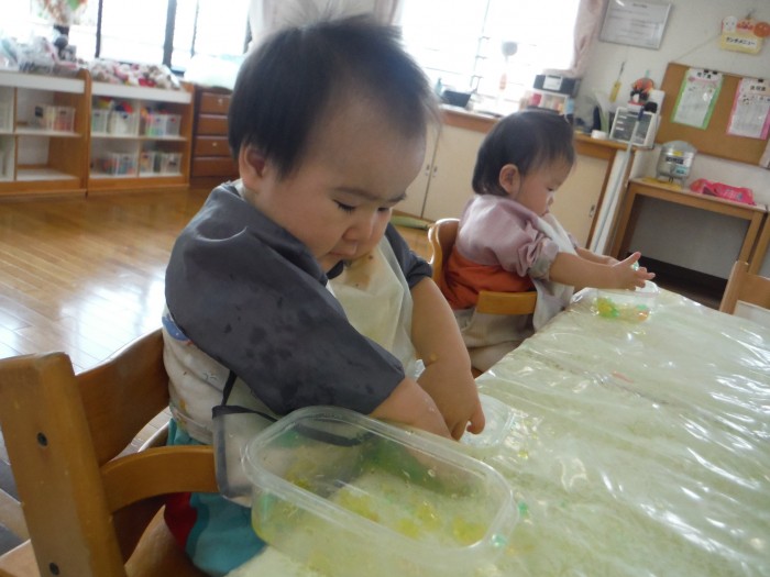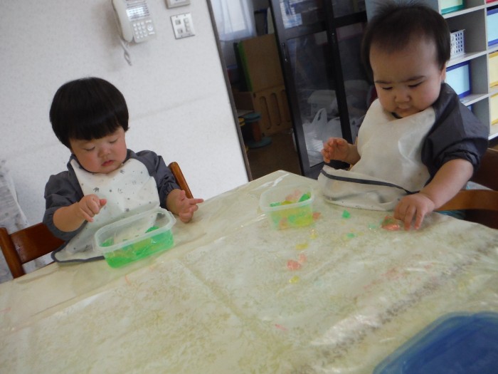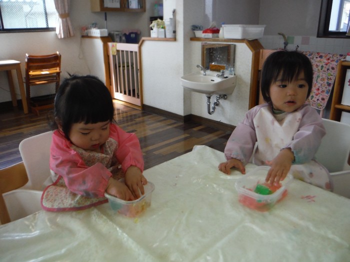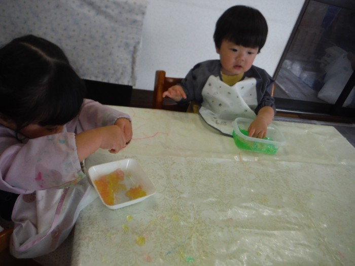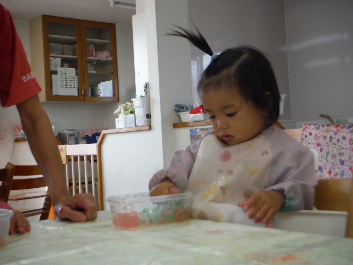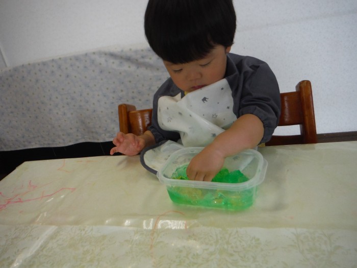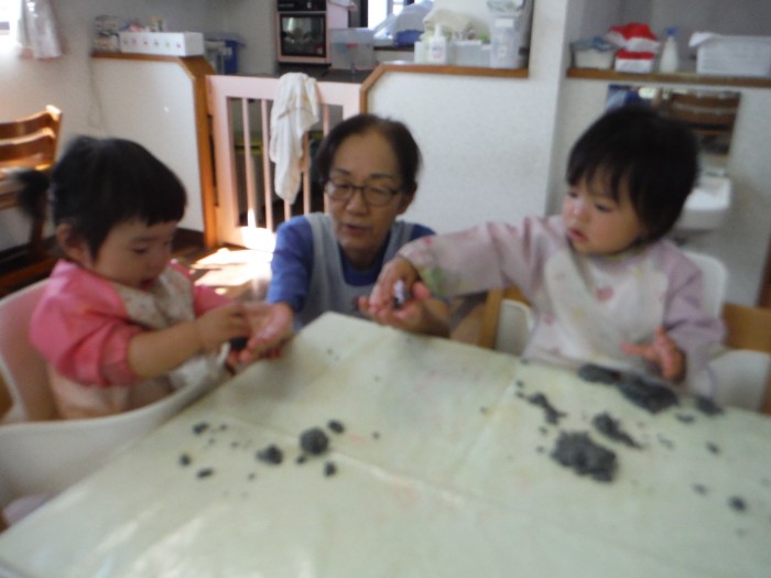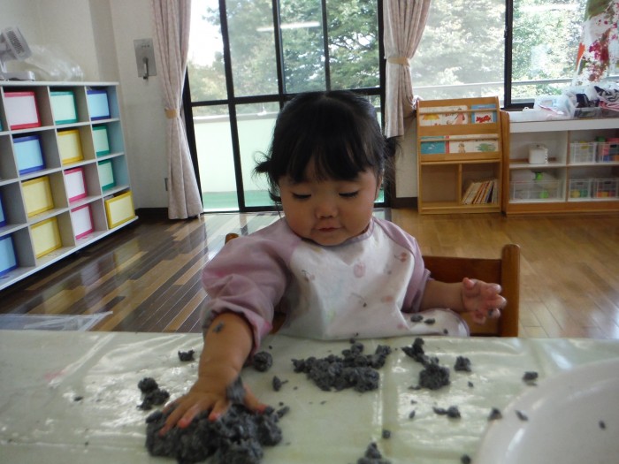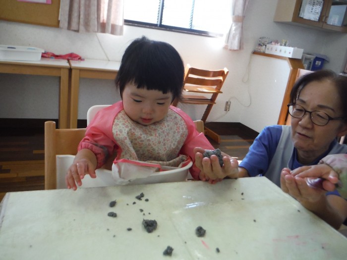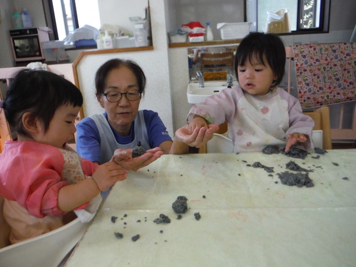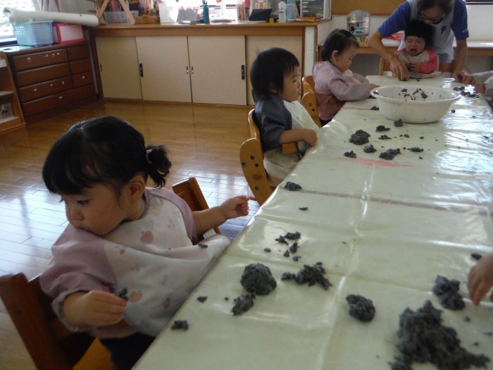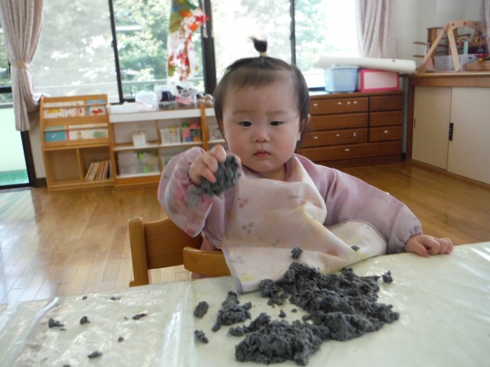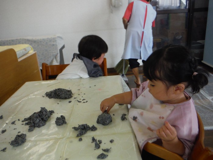 新聞紙粘土遊びの様子。不思議な感触だね!