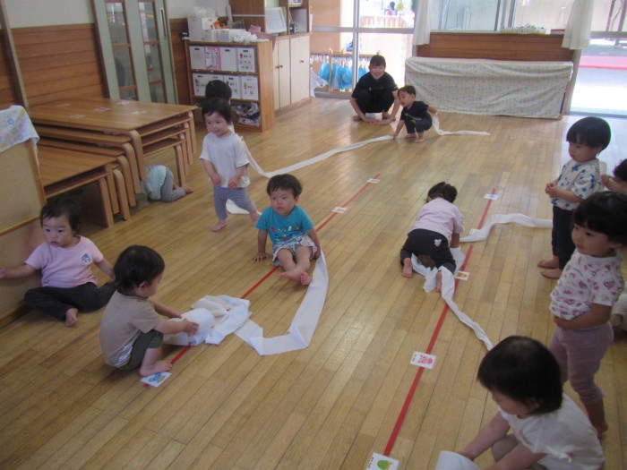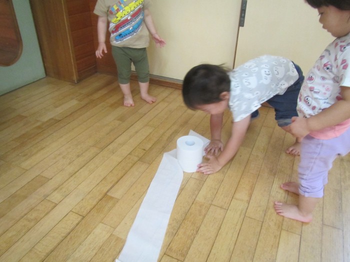 トイレットペーパー遊びをしました。コロコロ転がるトイレットペーパーを目で追ったり「待て待て~♪」と走って追いかけたりしました。