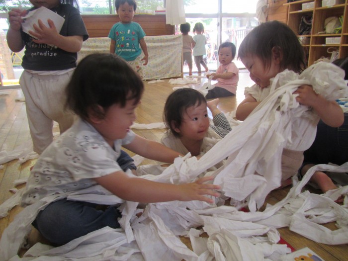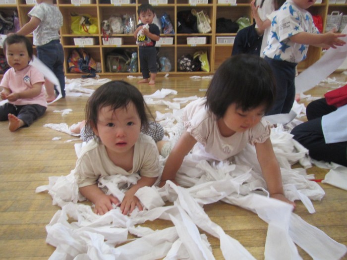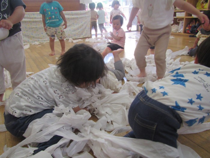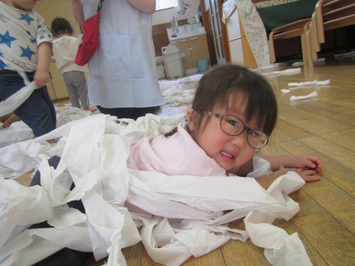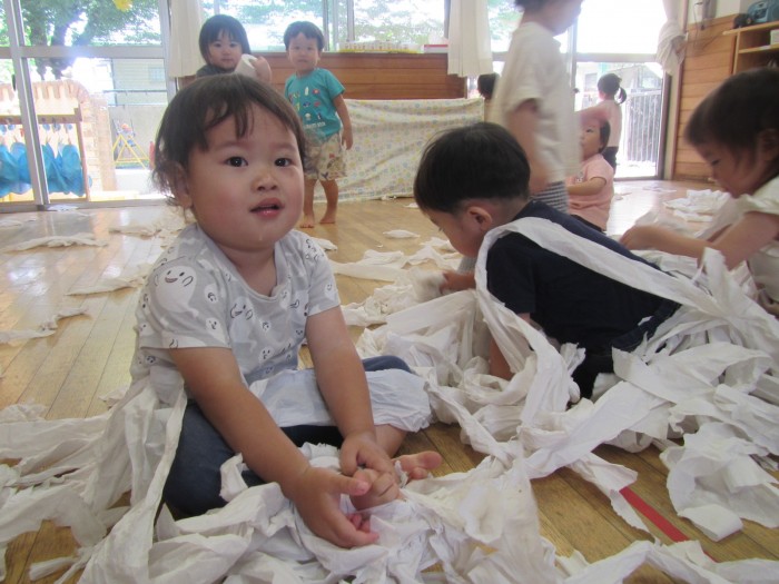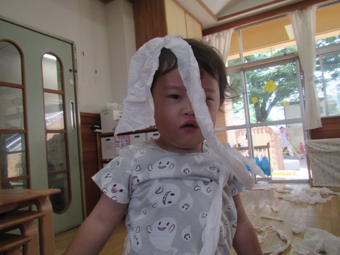 たくさん転がしてトイレットペーパーのお布団にしたり「おばけだぞー!」とお化けに変身したり、引っ張りっこして楽しみました。