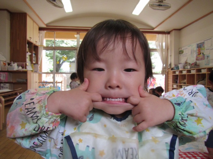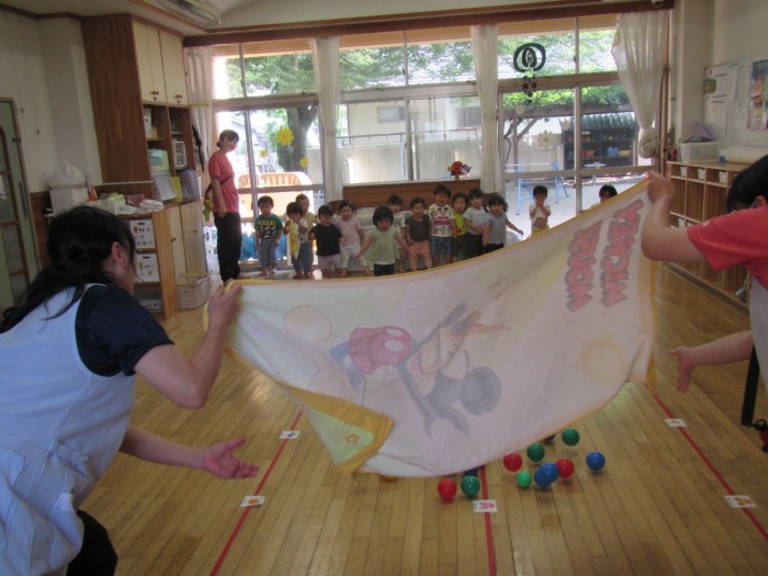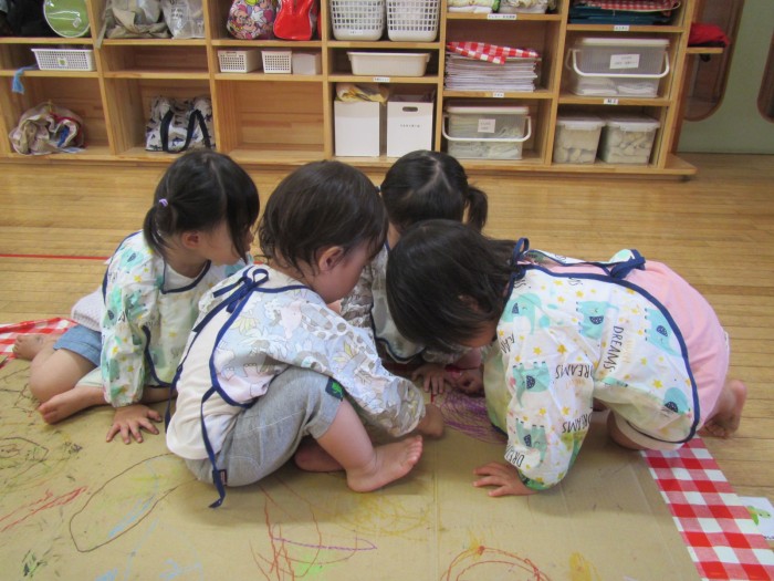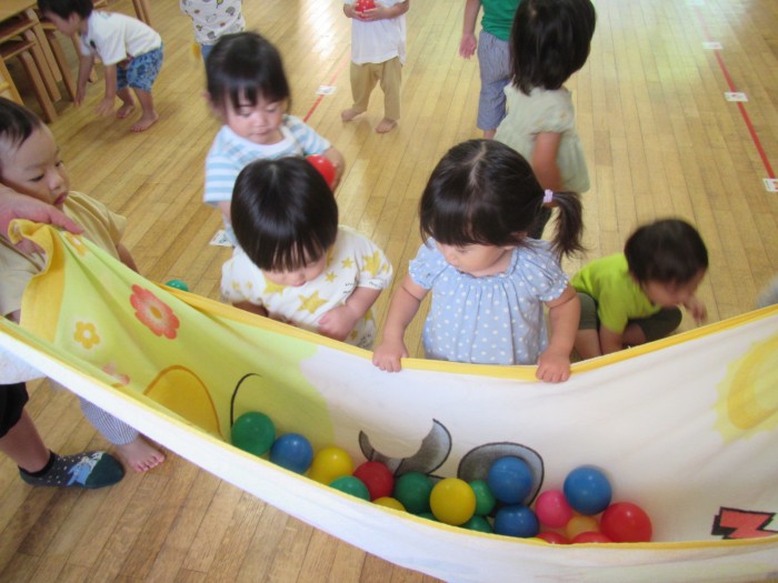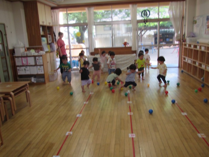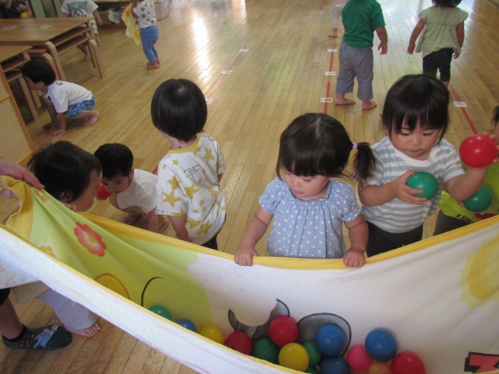お部屋でボール遊びをしました。「3・2・1・それ~」で転がるボールを追いかけて遊びました。転がしたボールをタオルの中に入れて、またまた「それ~」拾っては転がしと、何度も転がしてボール遊びを楽しみました☺️