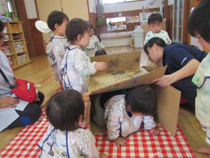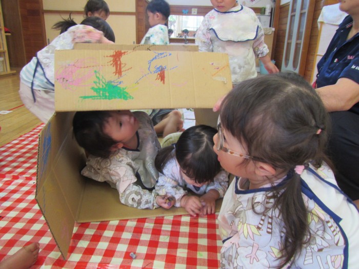 みんなでお絵描きした段ボールを組み立てて、トンネルの完成