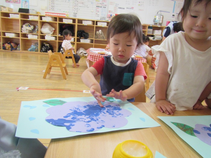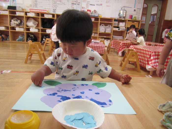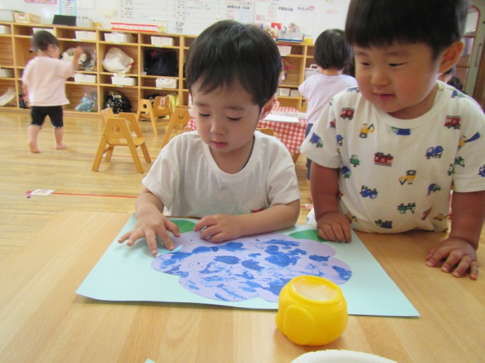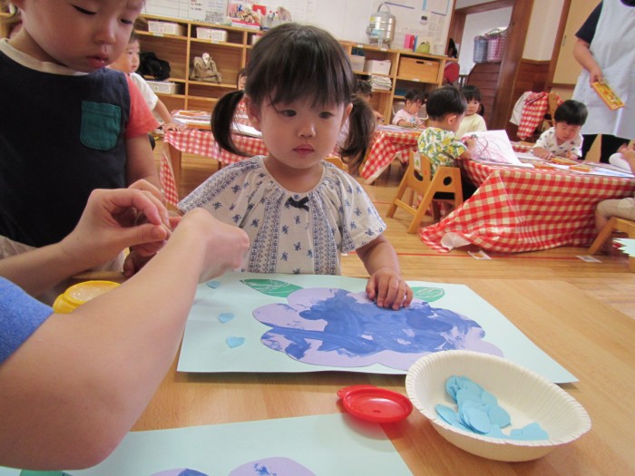 絵の具で模様を付けた後にのりで雨をペタペタ☺️