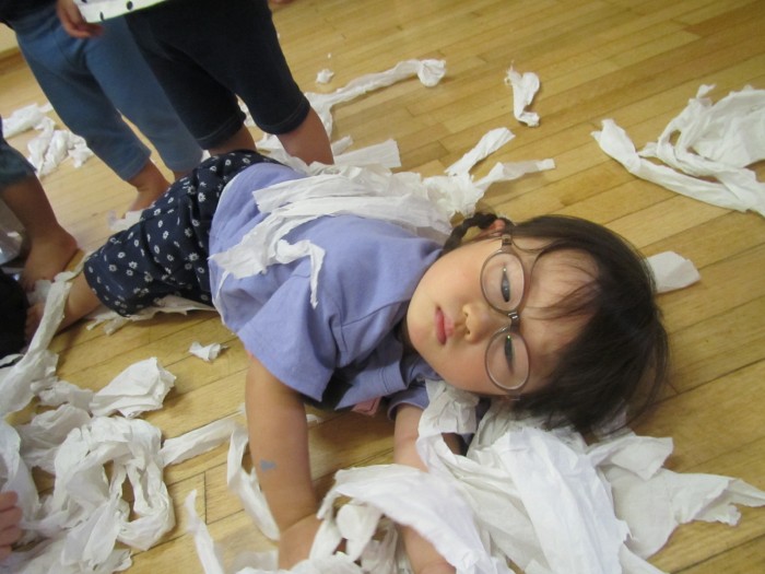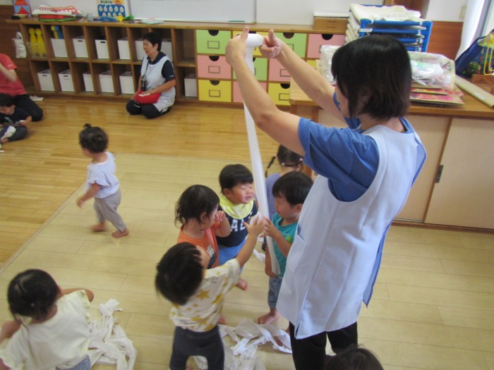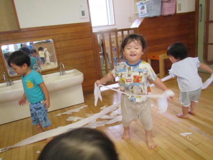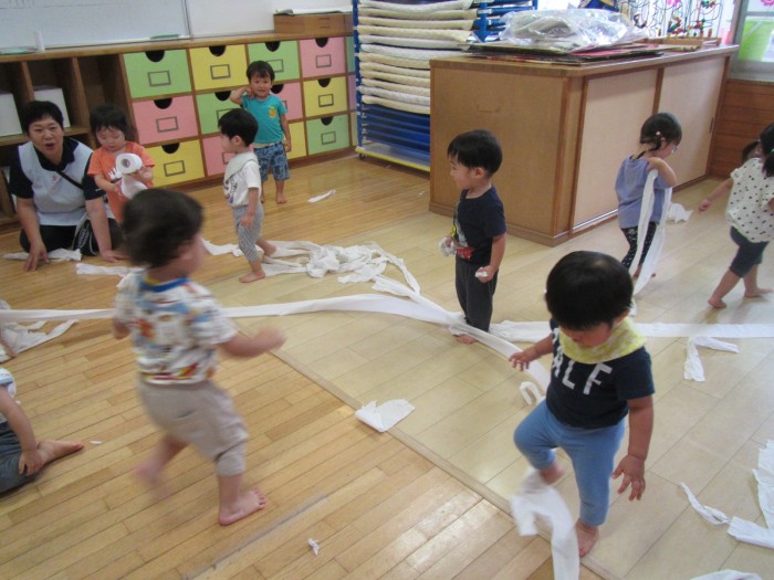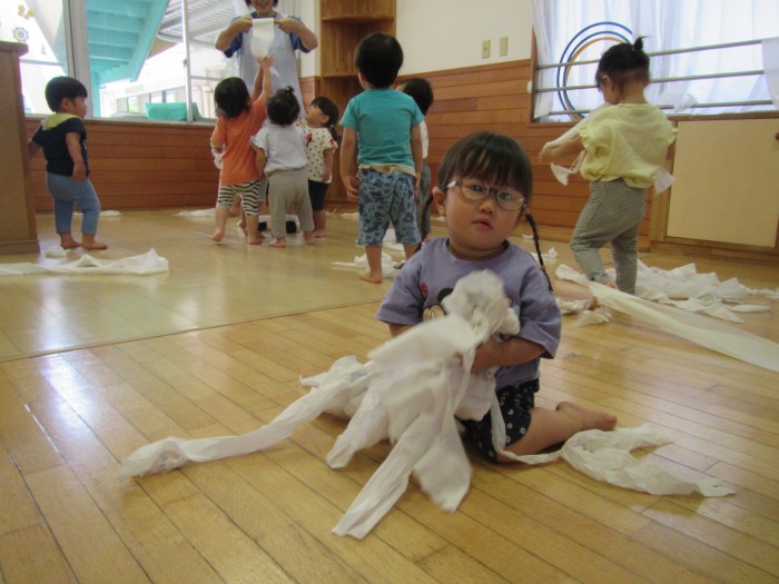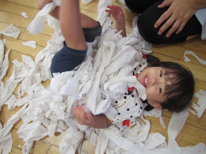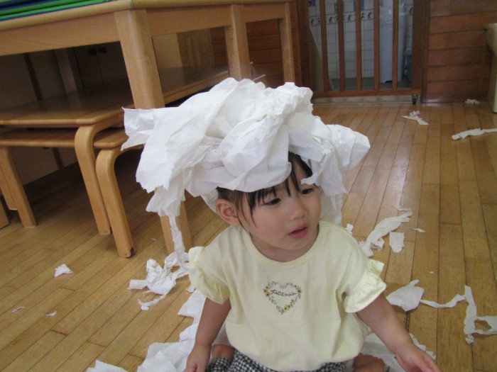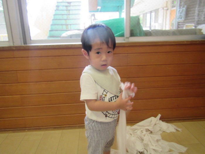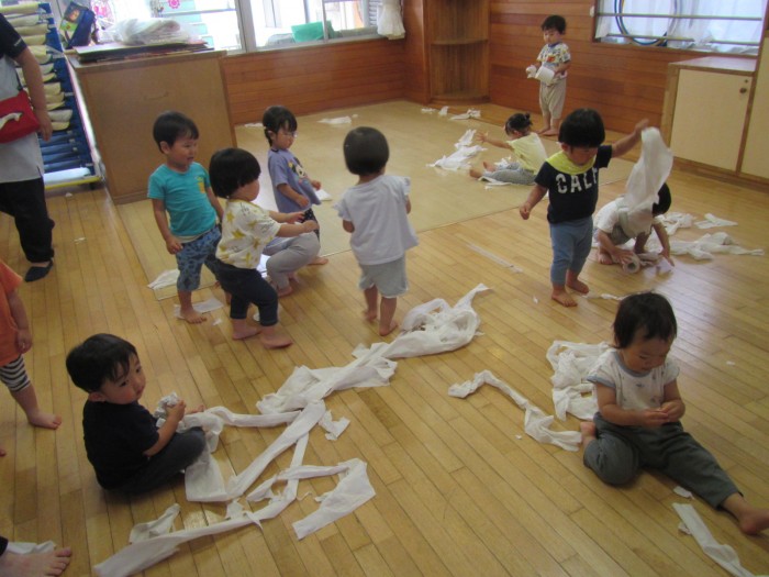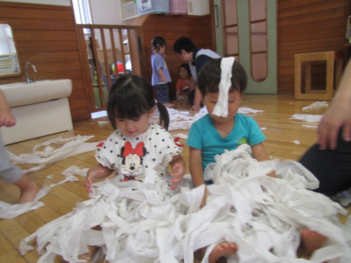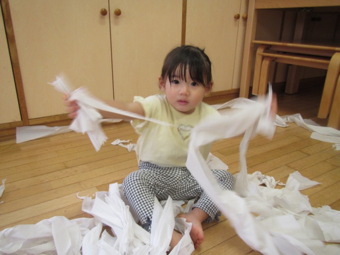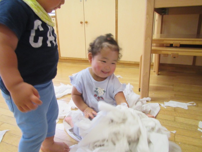 感触遊びをしました。トイレットペーパーを引っ張ったり転がしたり、ビリビリちぎったりして楽しみました♪ また、かたまりのトイレッとペーパーを頭にのせたり、お布団に見立ててゴロンしたりとそれぞれが楽しみました☺️