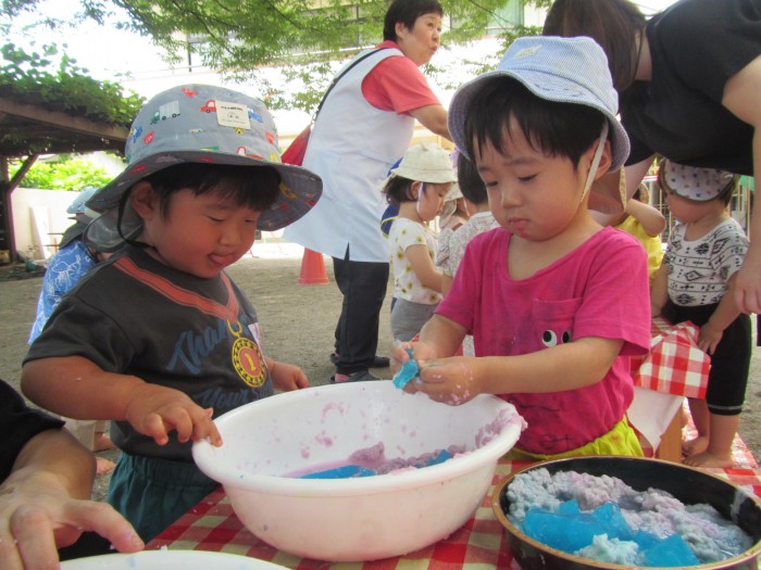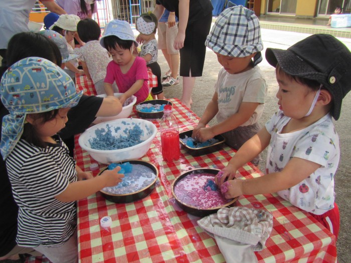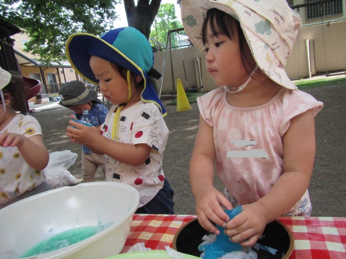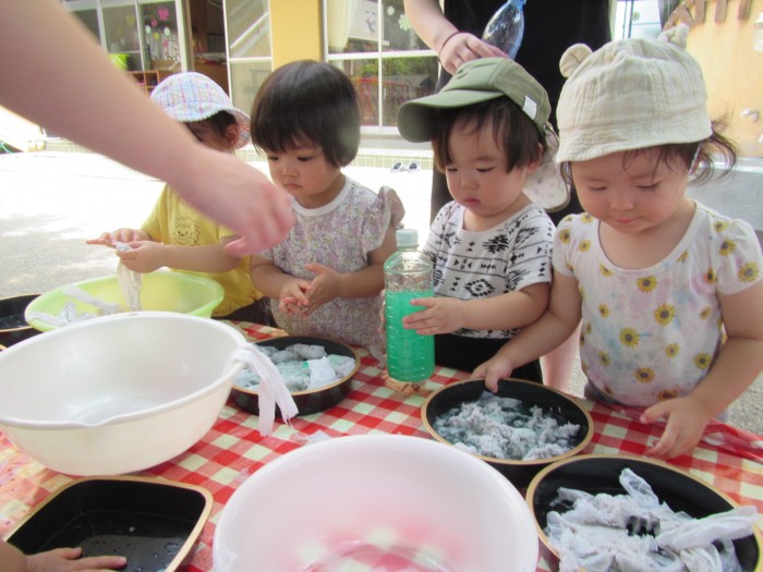 いろんな色を混ぜてカラフルにしたり、冷たい寒天をいれてぎゅっと握ったり☺️
