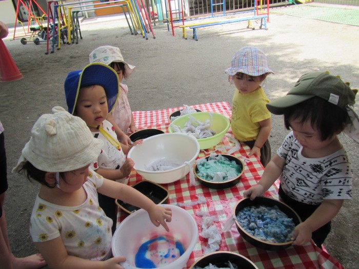 ちぎった紙に色水をつけてまぜまぜ🥄