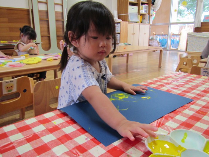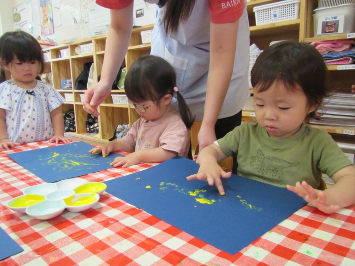 7月の制作で指スタンプでお星さまを作りました。だんだんと色づいていく様子を楽しんでいた子どもたちです。