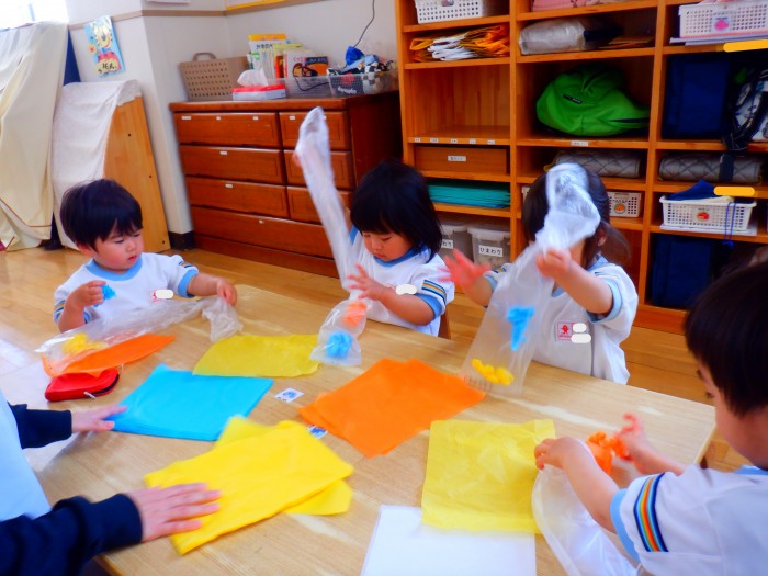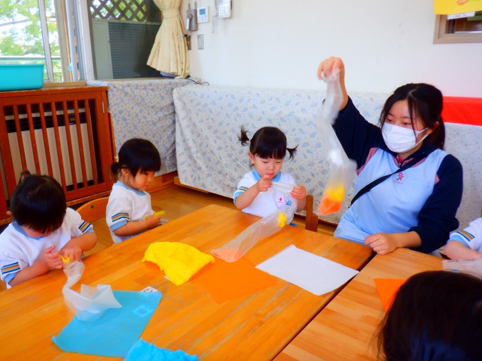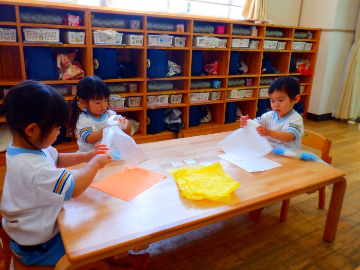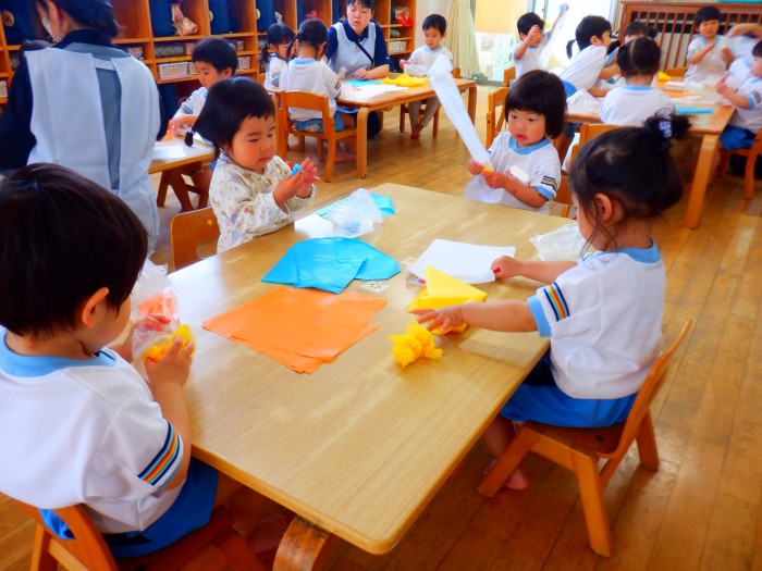 しっぽの制作をしました!傘袋に丸めたお花紙を詰めて、カラフルなしっぽを作りました。