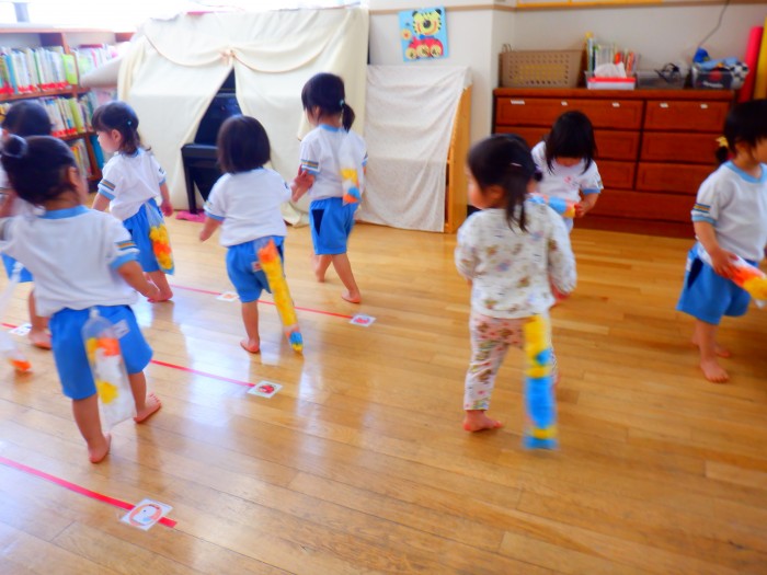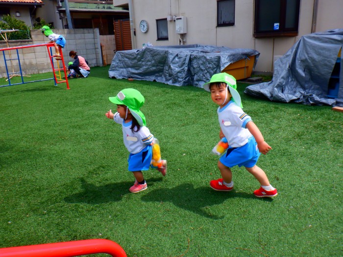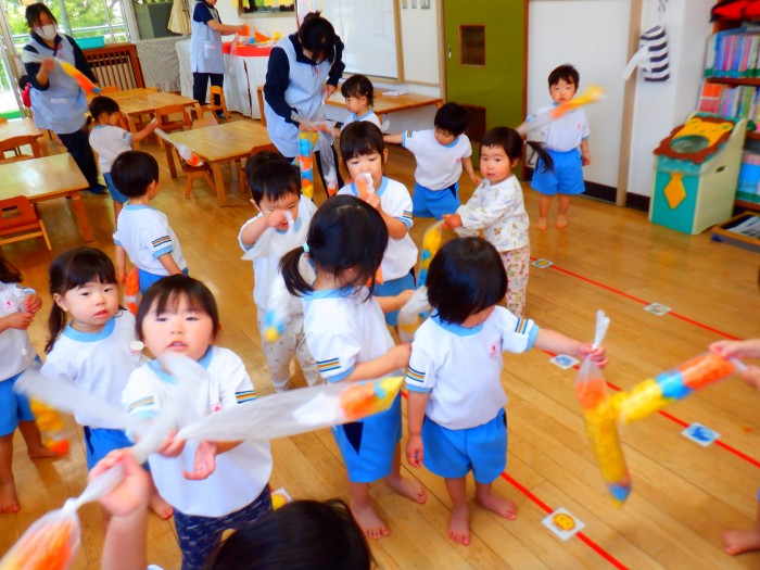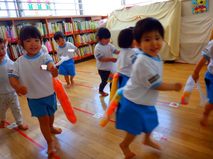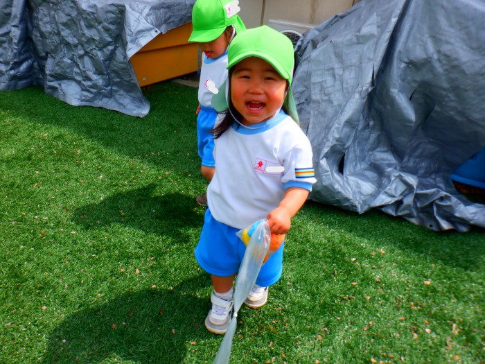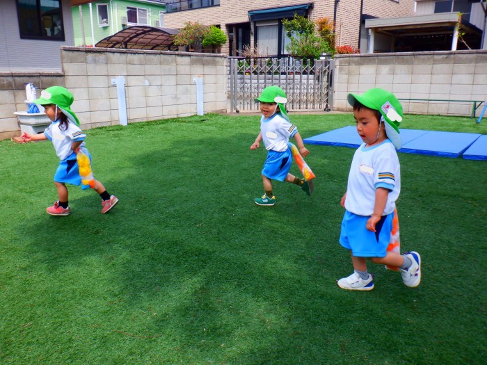 クラスのみんなで外でしっぽ取りをしました!「待て待てー!」といいながらお友達や先生を追いかけてしっぽを取ると嬉しそうに「とったよ!」と教えてくれたひまわり組さんでした