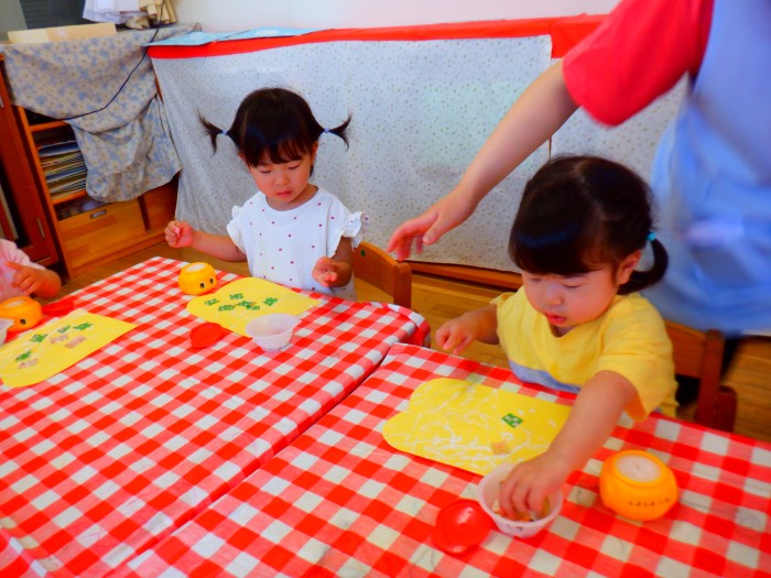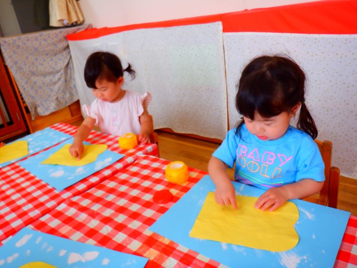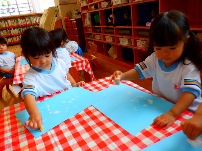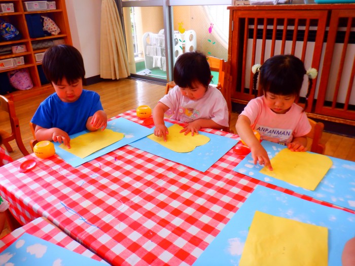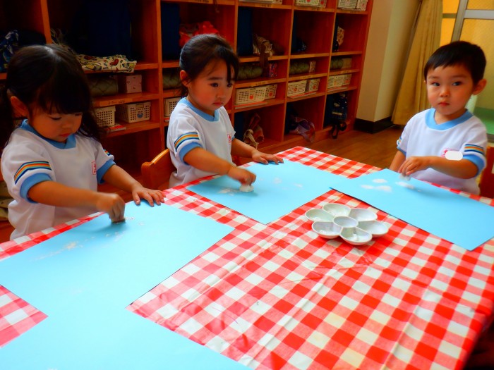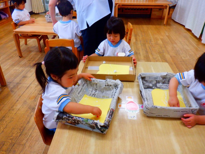スポンジスタンプで空に雲を描きました。「ポンポン!」と言いながら楽しくスタンピングができました。その後、ビー玉を転がして模様を付けました。たくさん箱を傾けて転がる様子に大喜びでした!