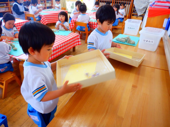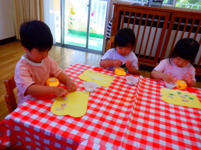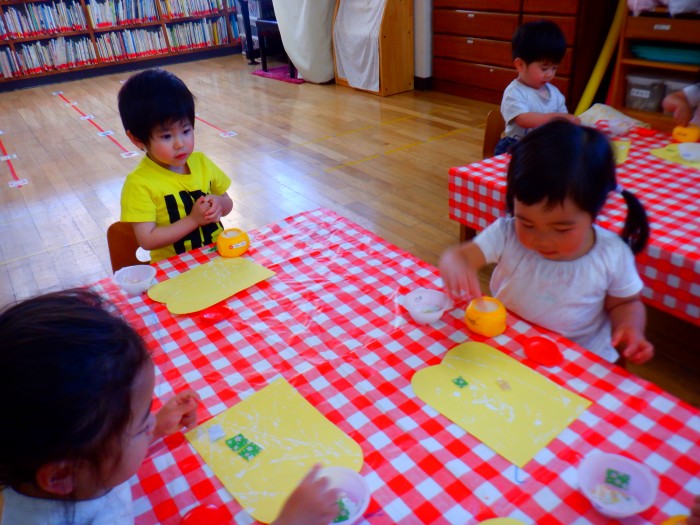うろこののり付けでは「ピンポーン!のお指でチョンチョンだよ!」とお話しながら折り紙に糊を付けてペタペタ貼ることができました!貼り終えたら「見て見て!」と嬉しそうに作品を見せてくれたひまわり組さんでした✨
