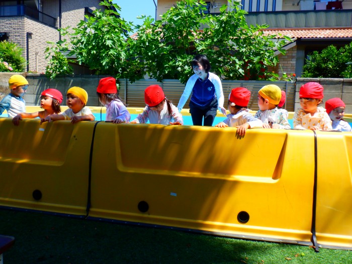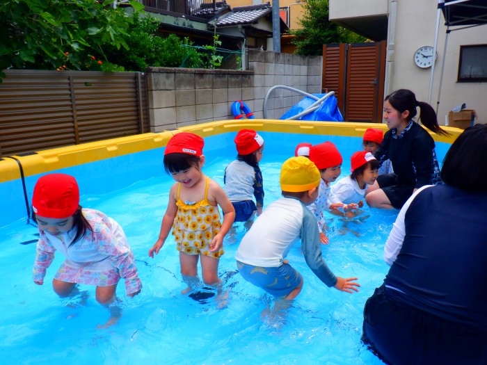 ひまわり組になり、大きいプールに入ることにワクワクしていました✨「冷たい!」「楽しい!」と言いながら先生にお水をかけてニコニコ笑顔でした☺️