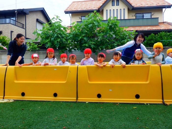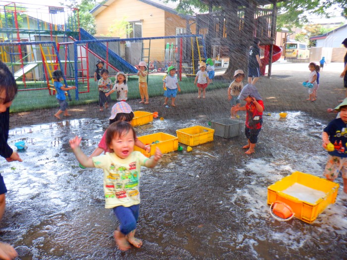 どろんこは、昨年度に比べて大胆にバシャバシャと遊んでいました。どろんこ着のキャラクターに「お団子どうぞ!」と言ってお団子をこねてあげてみたり、シャワーのトンネルを走ってくぐってみたり楽しく遊びました!