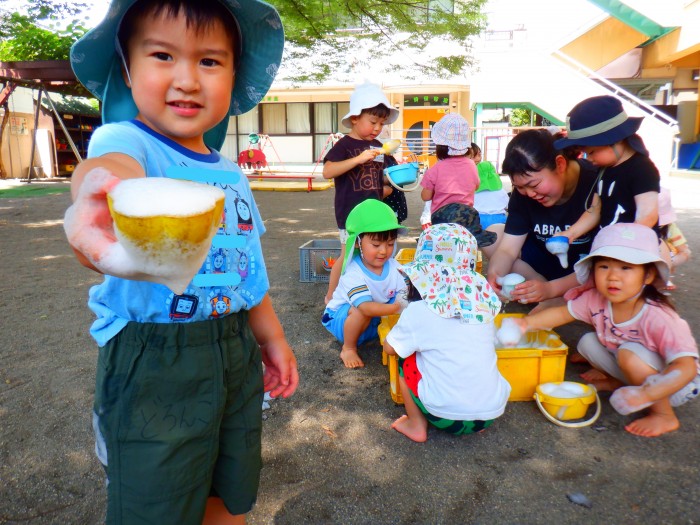 泡で感触遊び・どろんこ遊びもしました。泡をカップに入れて「アイスどうぞ!」と言ってお店屋さんごっこをしていました。「いいにおいする!」と泡を嗅いでみたり、「もこもこ楽しい!」とたくさん触ってみたり楽しく遊びました。