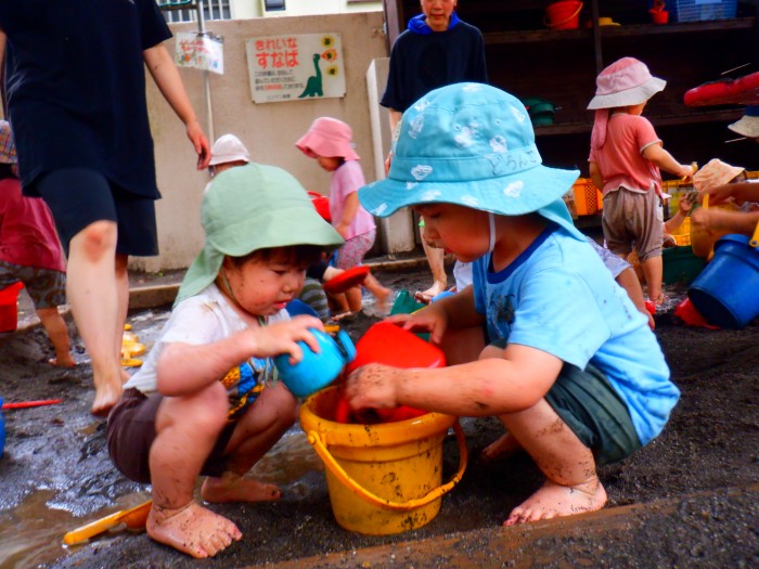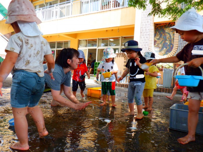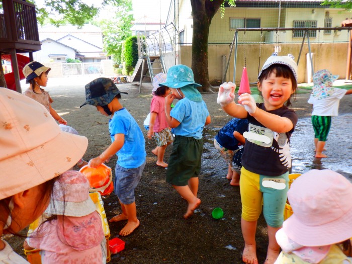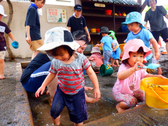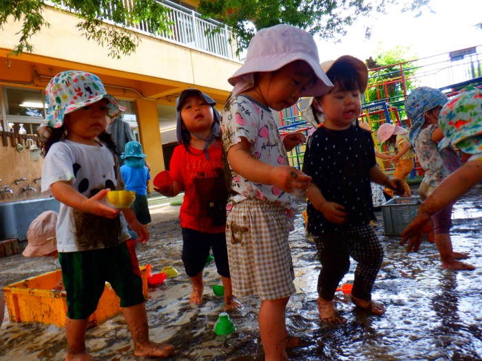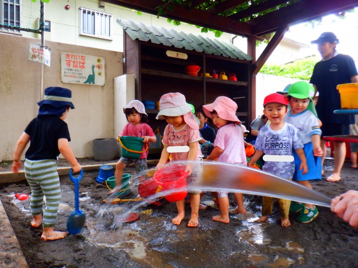 別日には砂場でどろんこ遊びをしました。水を流して大きな川を作りました。水たまりに入ってみたり、どろんこをカップに入れてケーキ屋さんを開いたり、みんな楽しく遊びました!