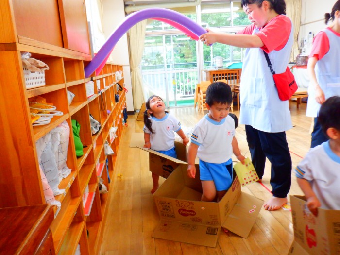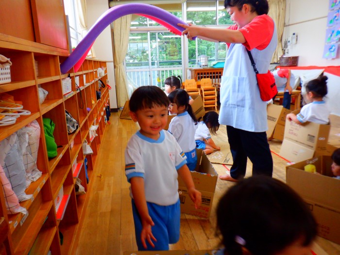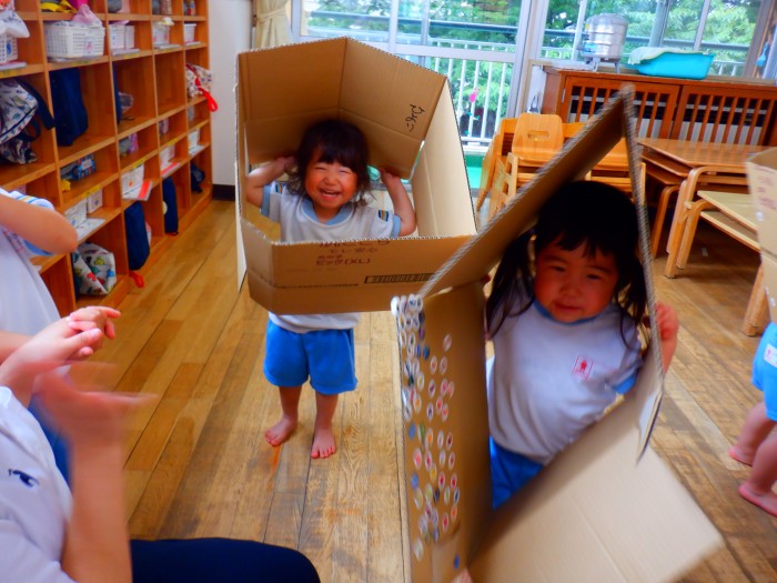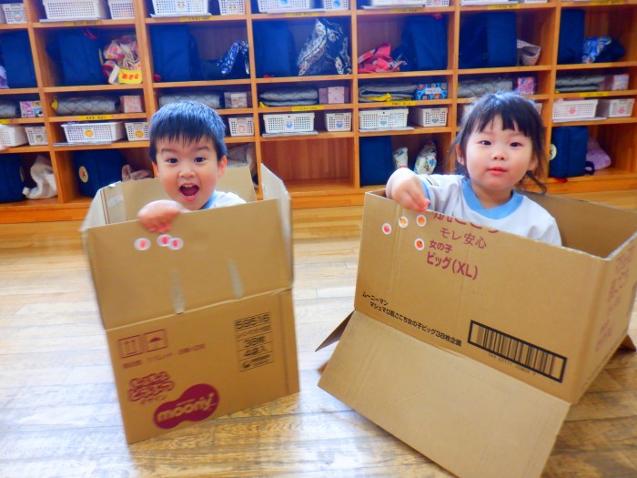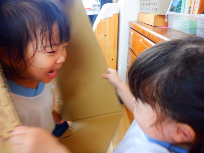 段ボールから顔を覗かせてお友達や先生に「ばあ!」と言っていました!