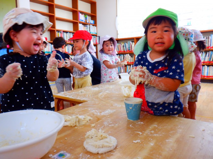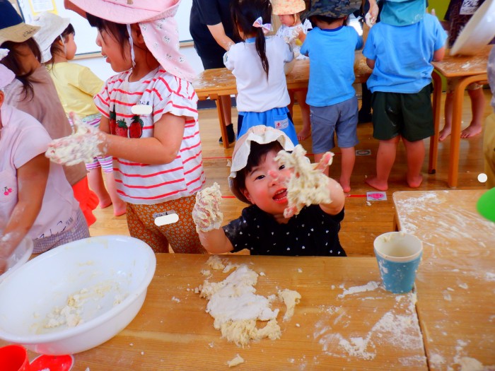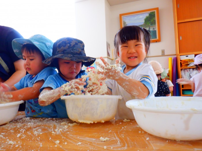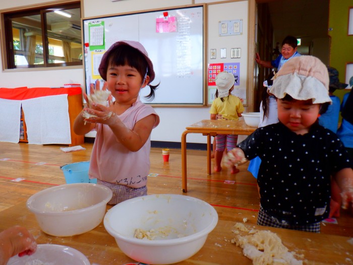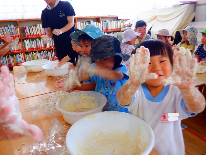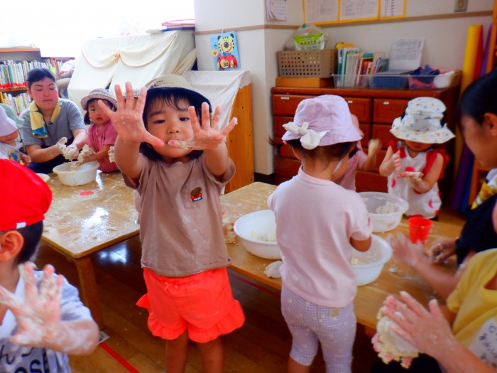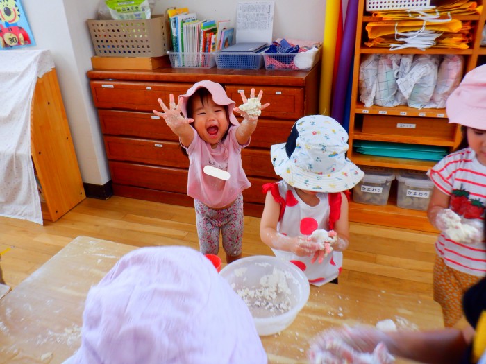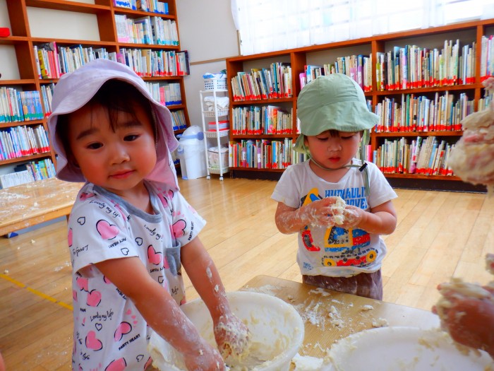 まずは粉を触って「サラサラだね!」とお話していました。その後水を混ぜるとベタベタ・ドロドロな感触になり、固まるまで皆で「こねこね!」と言いながら触っていました。