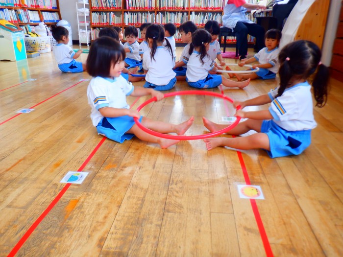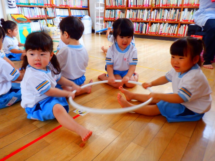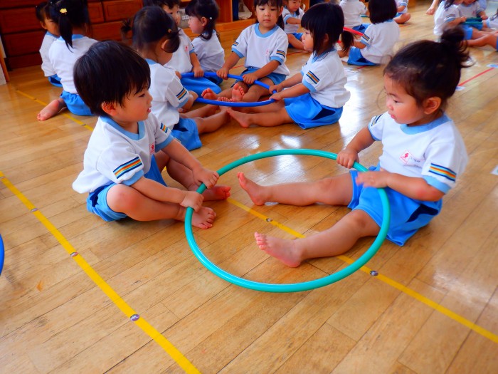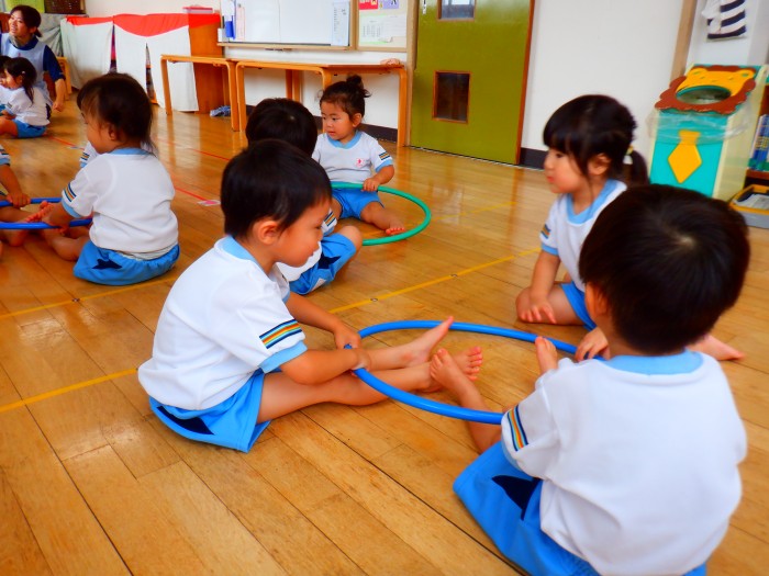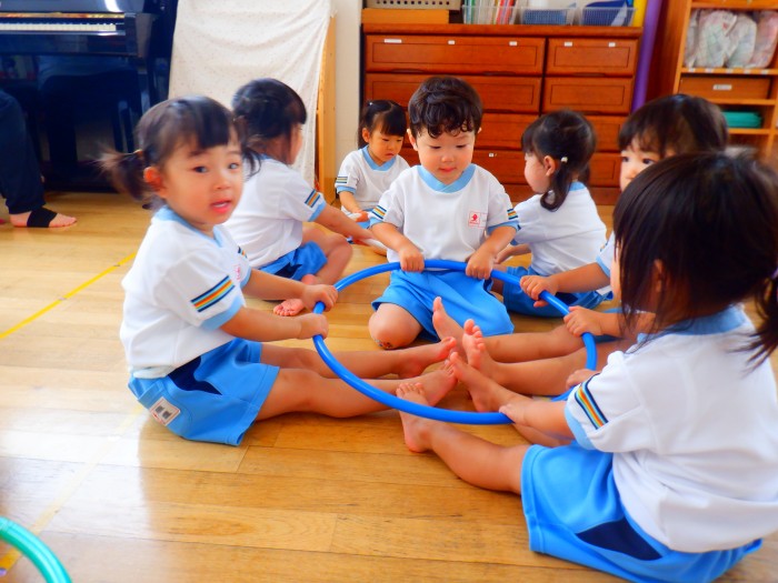 フラフープを掴んでおふねはぎっちらこをやりました。お友達と一緒に掴んで揺れながらお歌を歌っていました🚢