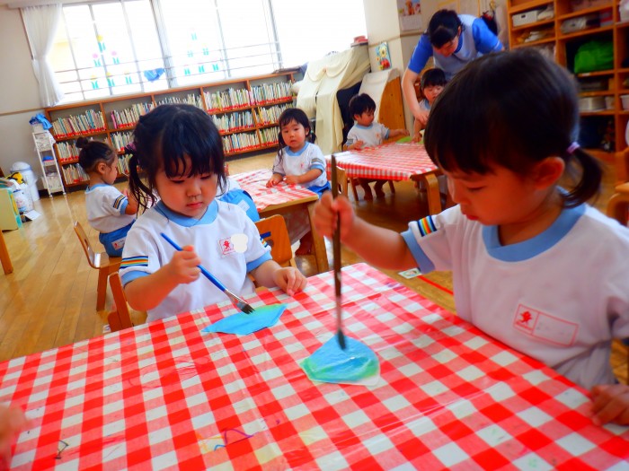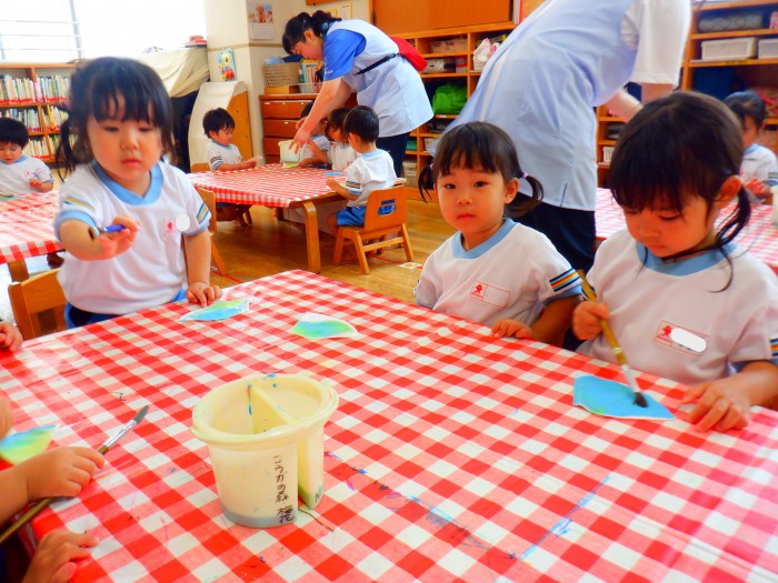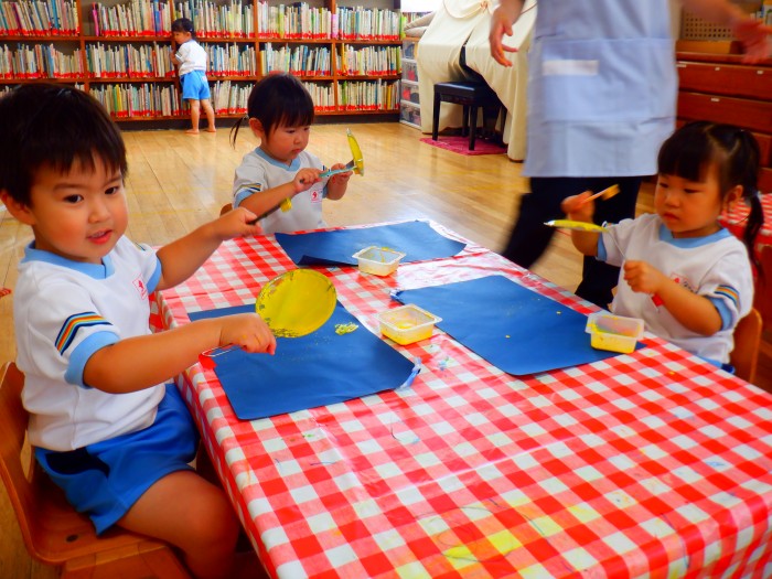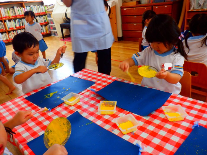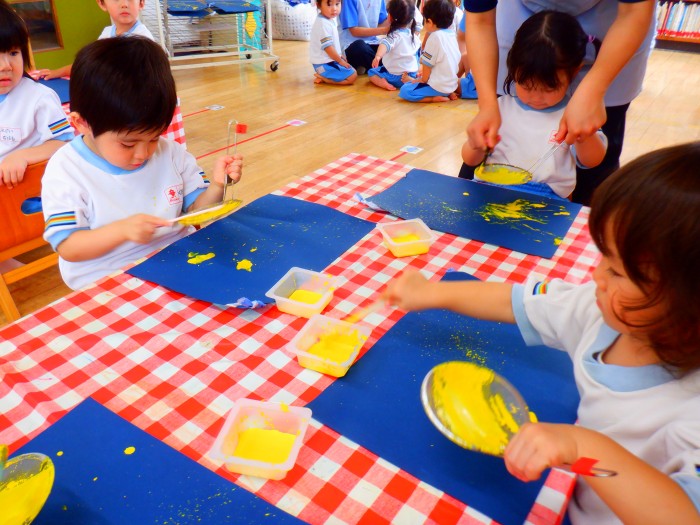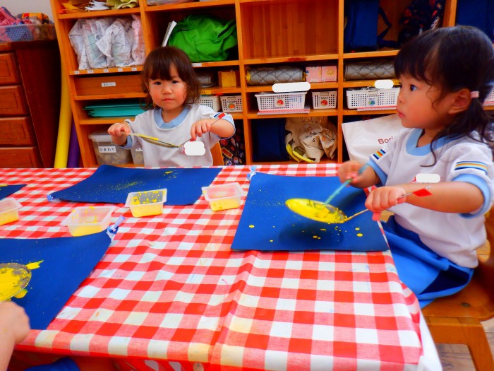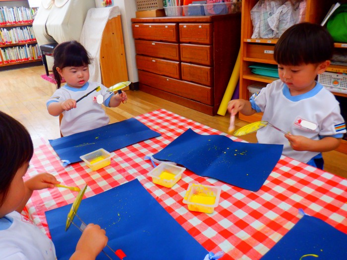ブラッシングで画用紙に星を描きました。シャカシャカすると模様がつく様子に興味津々で嬉しそうでした⭐️