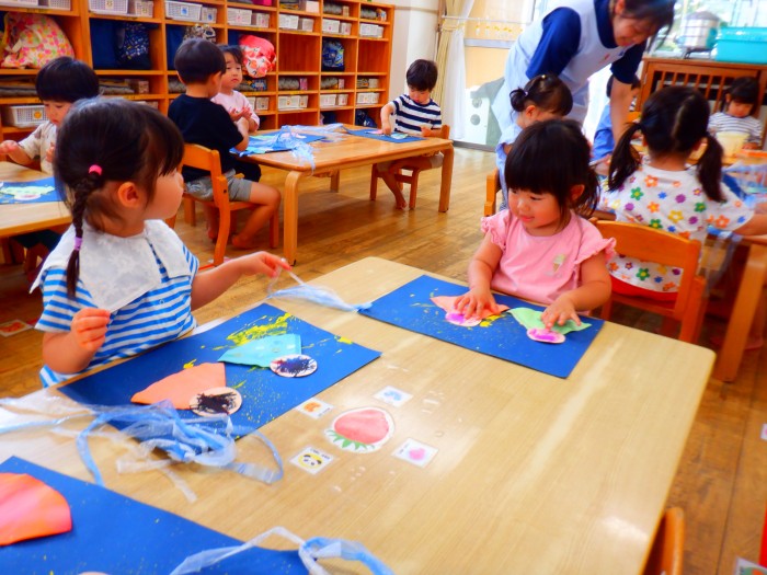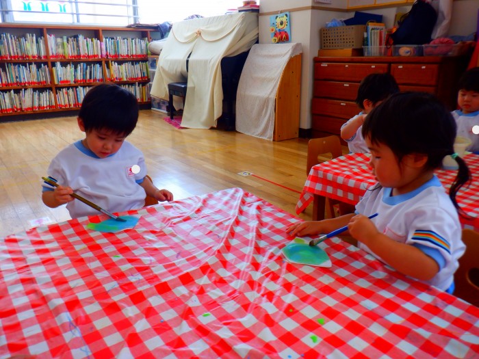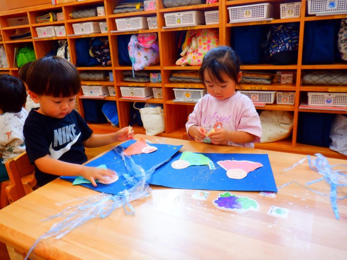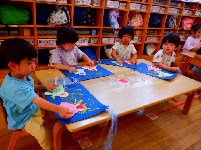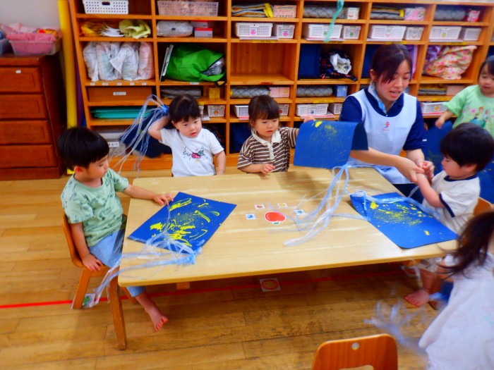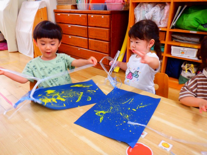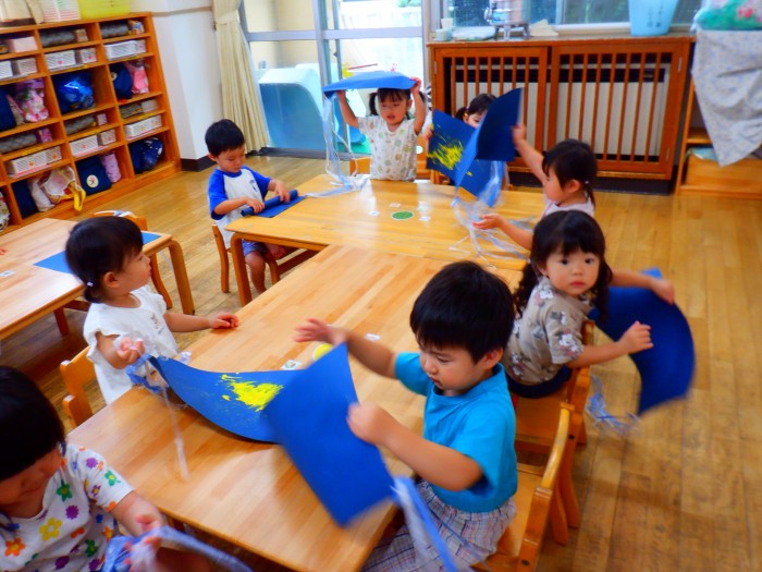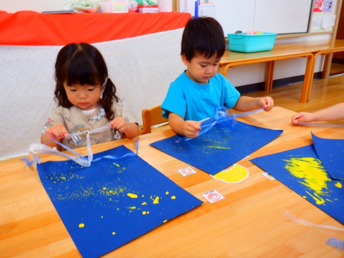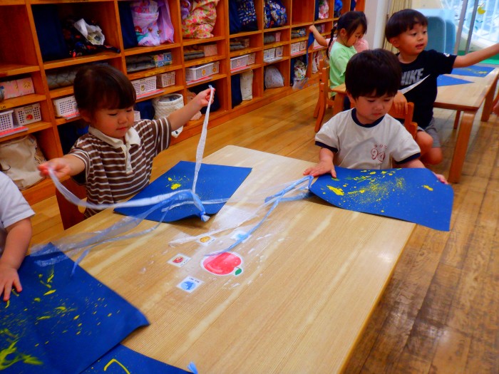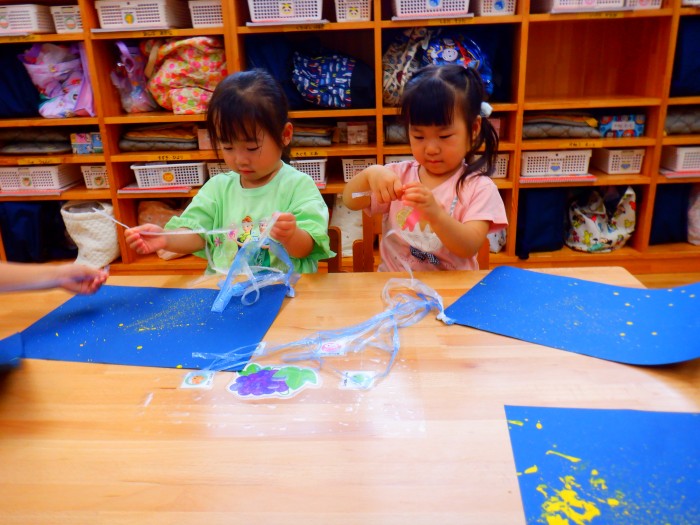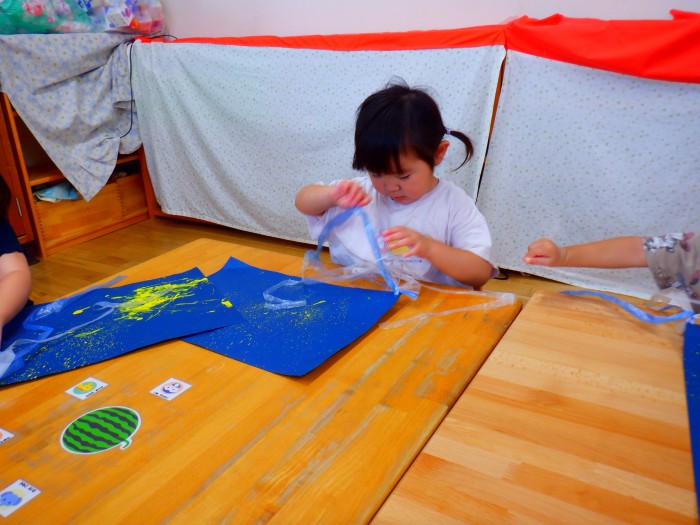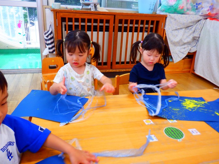 スズランテープの天の川をさきました。「めんめんみたい!」と言いながらたくさんさいていました。