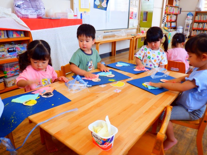 織姫と彦星を台紙に貼り付け、素敵な作品が完成しました☺️