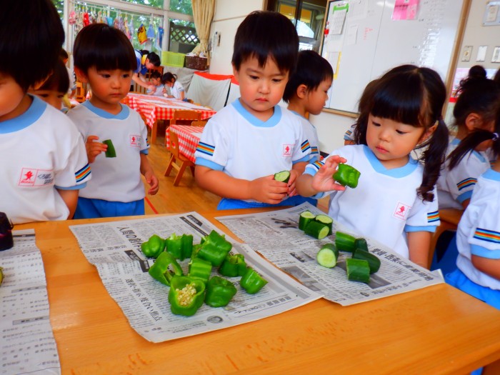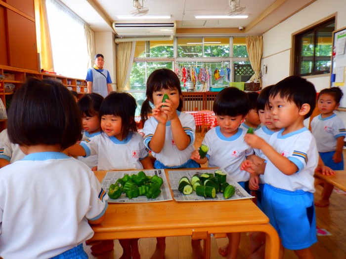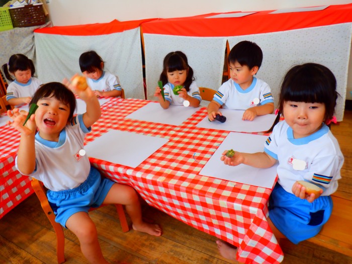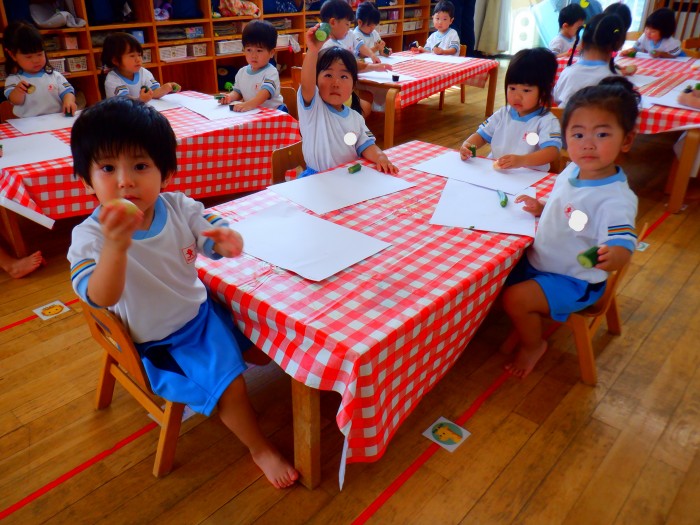 「この野菜なんだ?」と先生がお話するとみんなで野菜を見て「きゅうり!なす!」と名前を元気いっぱい教えてくれました🥒🍆