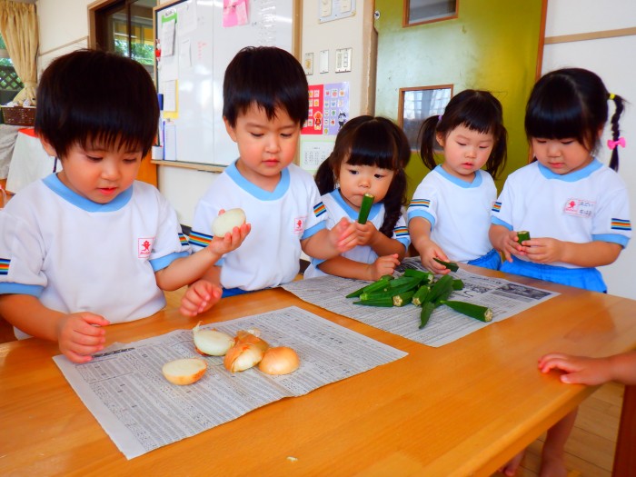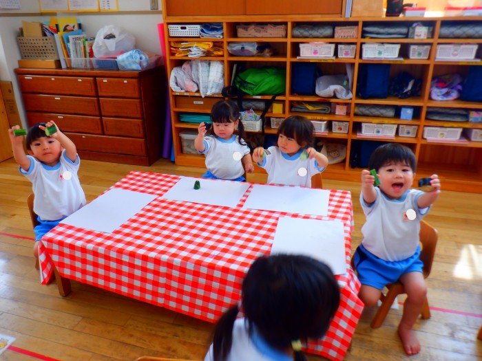 自分の椅子に座り野菜を持ちながら先生に見せてくれる姿がかわいらしかったです☺️