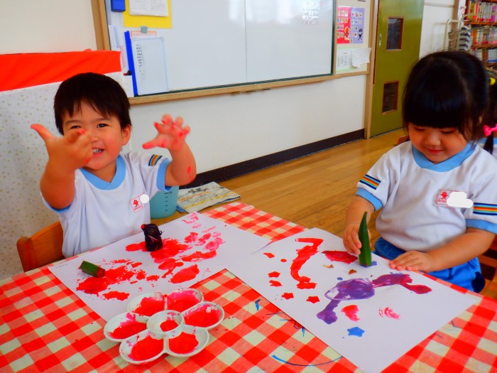 絵の具をつけて画用紙にペタッ!「お花の形みたい!」「丸がいっぱいだよ!」と思ったことをお話しながら楽しくスタンプを押して遊んでいました☺️