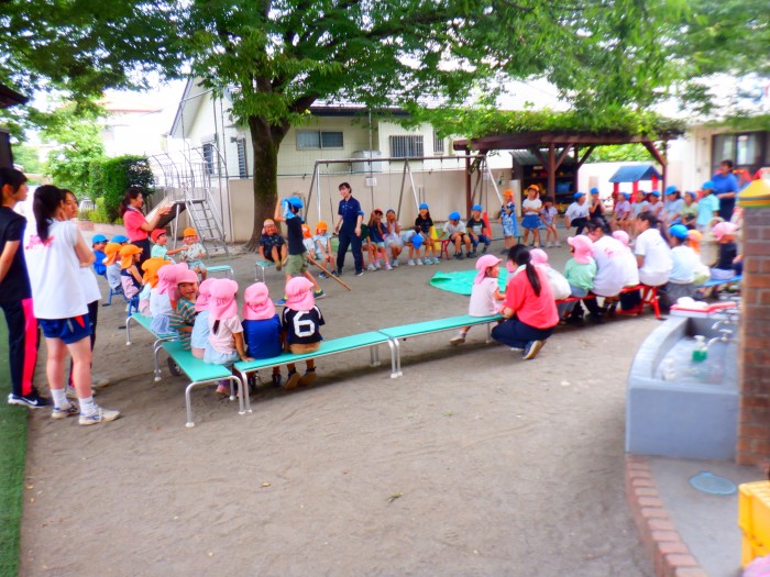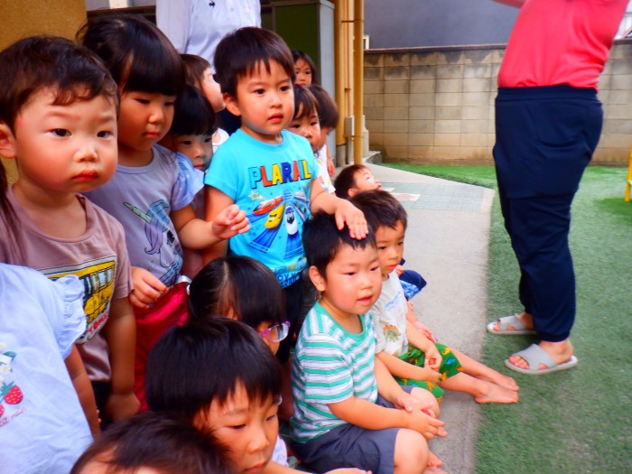 つばめ組・とんぼ組・学童さんのスイカ割りを見学しました。大きなスイカや目隠しをして頑張るお兄さんお姉さんの姿をじーっと見ていました。「頑張れー!」と元気な声で応援していたひまわり組さんでした🍉