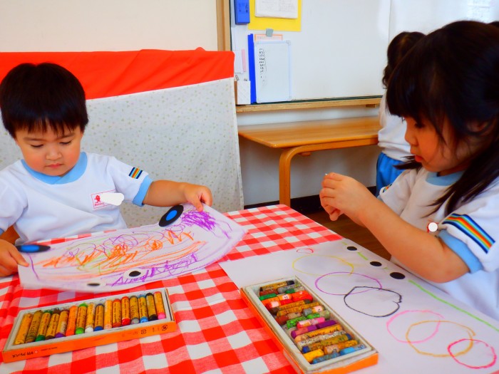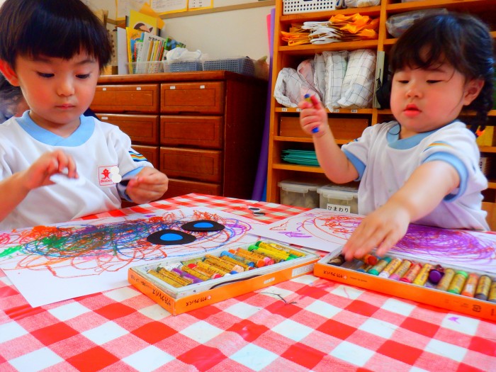 見立て絵をしました。クレヨンで画用紙になぐりがきをしたあとに、目とタイヤのパーツを貼ってみよう!とお話すると嬉しそうに自分でパーツを選んで貼っていました。腕をグルグルとたくさん動かして描くのがとても上手になってきました。