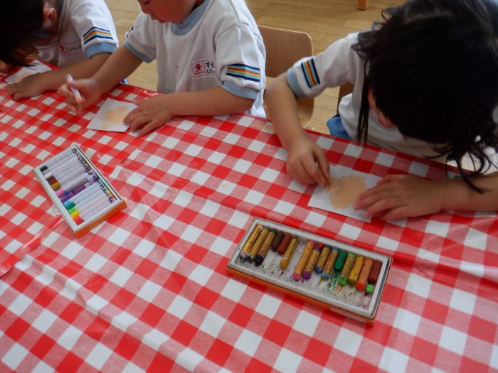 うすだいだい色のクレヨンで卵の形を描き、塗り込みをしました。