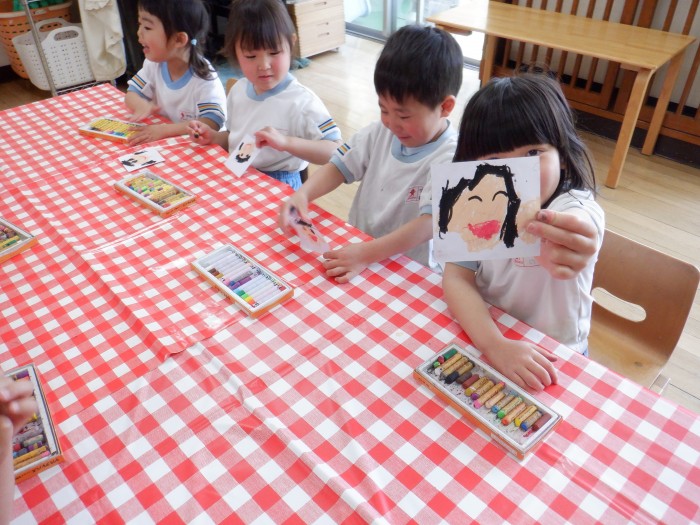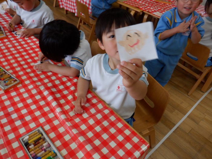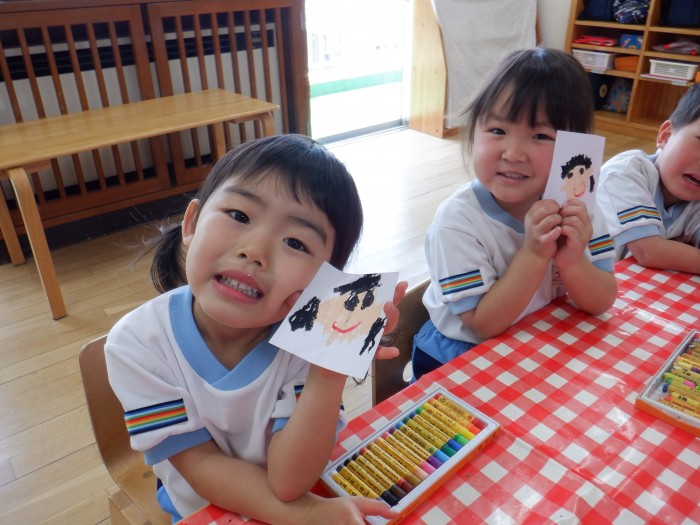 最後に髪の毛を描きました。「自分の髪の毛と同じように描いてね」と伝えると、「私は髪が長いからながーく描く!」「二つ結び、描けるかな?」「僕は短いからこれくらいにする!」と自分の髪を触ったり、お友達に見てもらったりしながら描いていました!