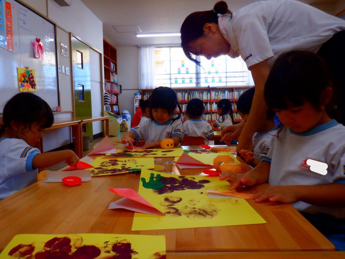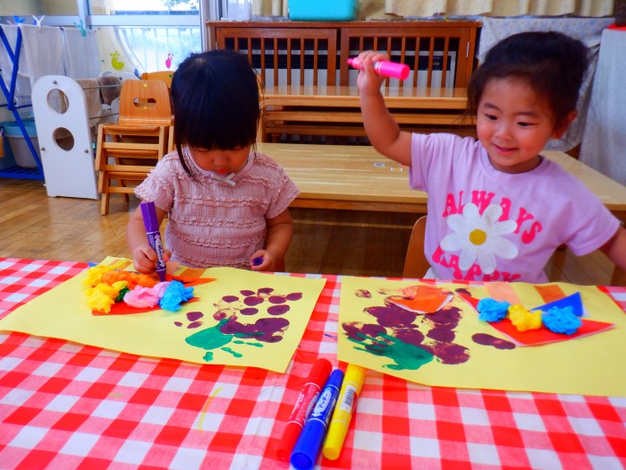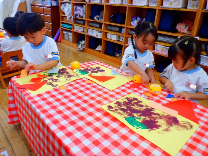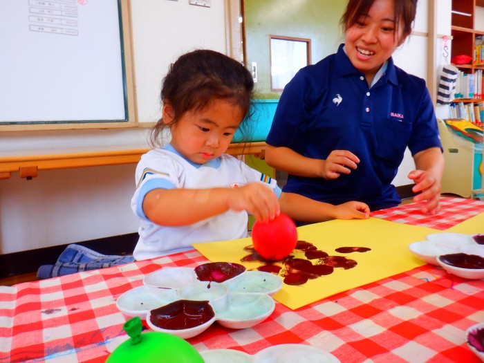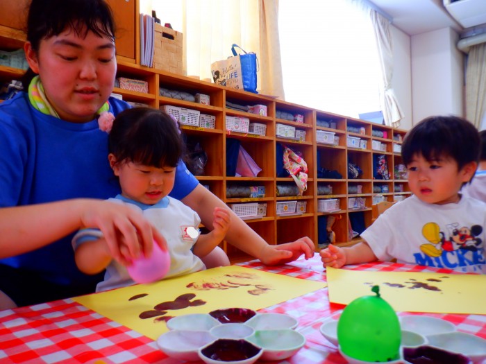 ぶどうときのこの製作をしました。水風船でスタンピングをしました。「ポンポン!」とたくさん押して「ぶどういっぱいになった!」と嬉しそうにしていました🍇