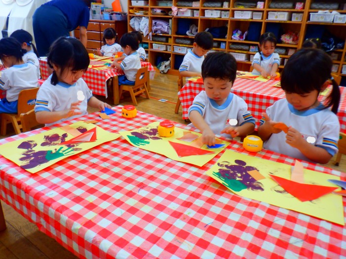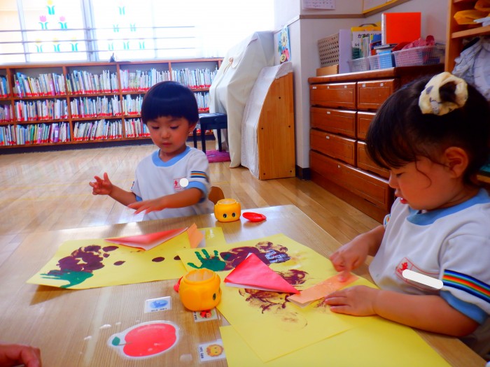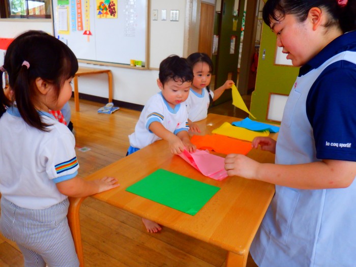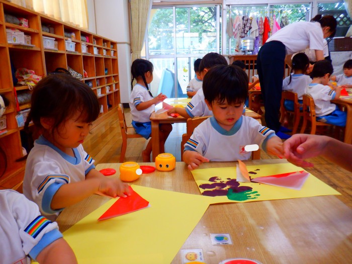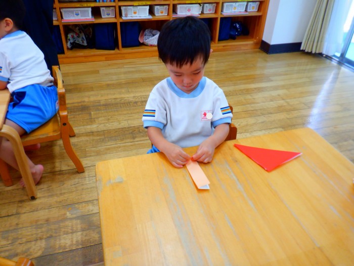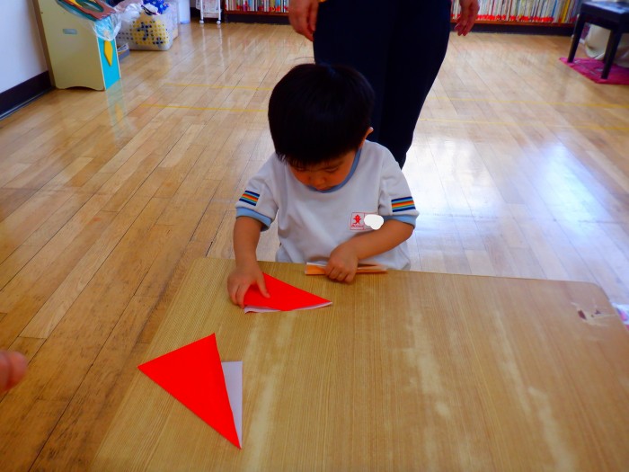 折り紙で三角と長方形を折りました。「角のチクチクを仲良ししてね!」とお話すると、慎重に折り指でのアイロンも「ピー!」とかけられました。