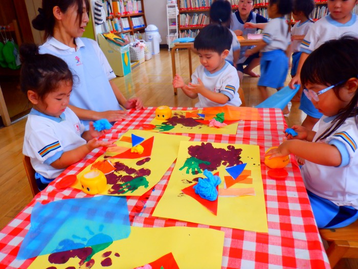 画用紙にノリで貼りました。「ぴんぽーん!のお指で塗ろうね!」のお話をよく聞いて貼ることができました。