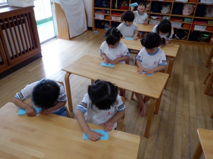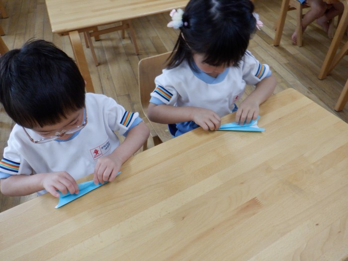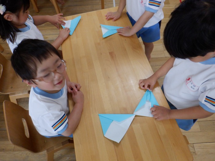 2種類の紙飛行機を作りました。「広がらないようにしっかり指でアイロンをして折ってね」と伝えると、折った後に指を使ってたくさんアイロンをして、広がってこないようにしていました!