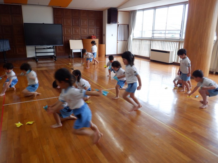「せーのっ!」の掛け声に合わせてみんなで一斉に飛ばして遊びました!「すっごい遠くまで飛んだ!」「横に飛んでいっちゃった~!」と夢中になって飛ばしていました☆