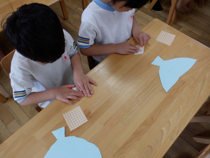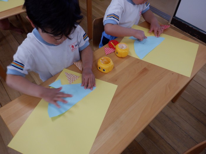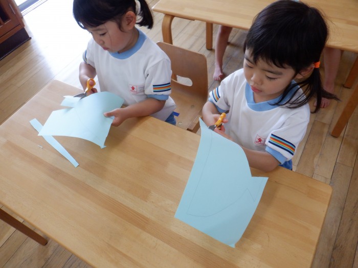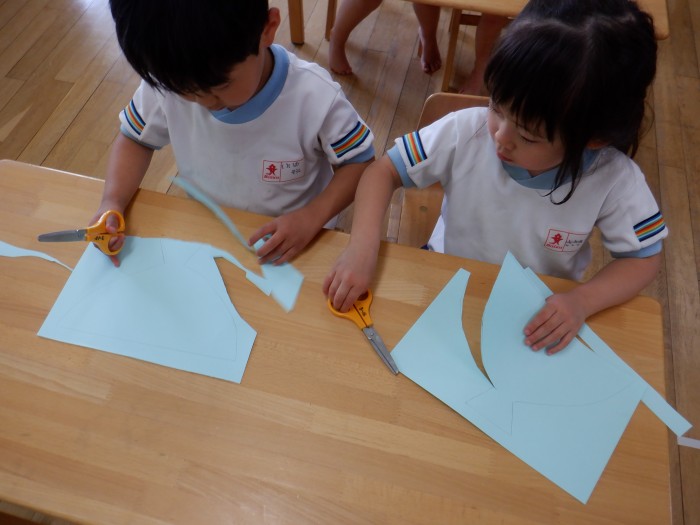下の方の形が難しく「どうやって切るの?」と戸惑っている子もいましたが、「紙を回して切るよ」「まわりを全部切って、最後に切ると切りやすいよ」と伝えると、自分の力で最後まで切ることができていました!