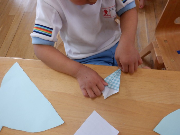 できた折り紙を合わせて貼ってみると、「すごい!リボンになった!」「可愛くなったね!」と大喜びのつばめ組さんです(^^)
