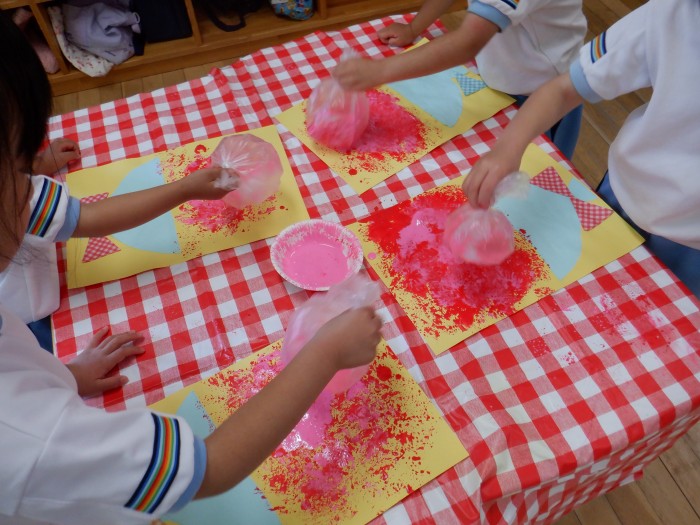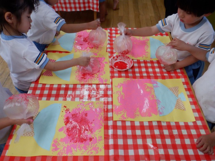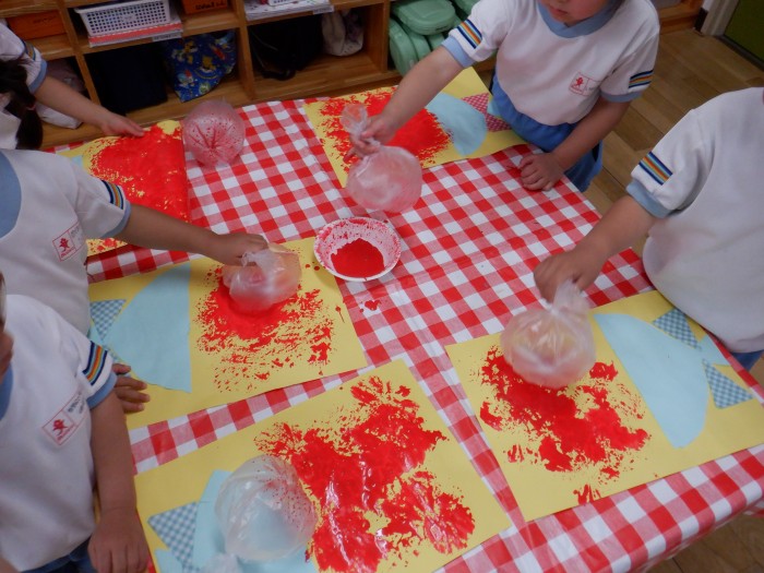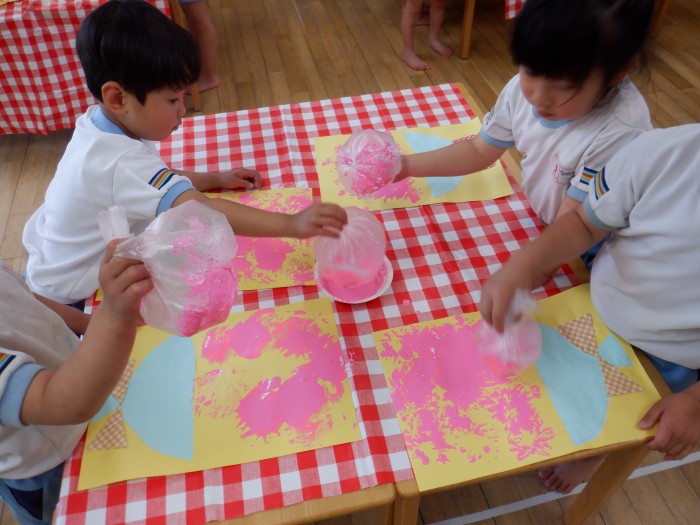 ビニール袋を使ってお花のスタンプをしました。「これ初めてやるね!」「早くやりたい~」とやる前からやる気いっぱいです!