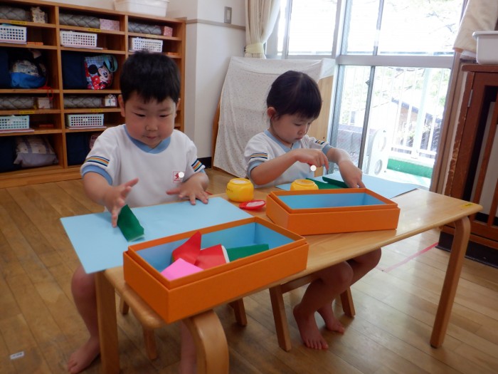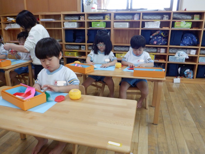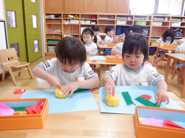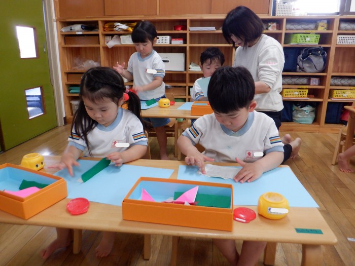 折った折り紙とハサミで切ったものも糊付けをしました。お母さん指でアリさんくらい少し取って塗っていました。