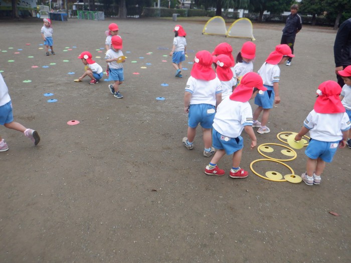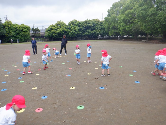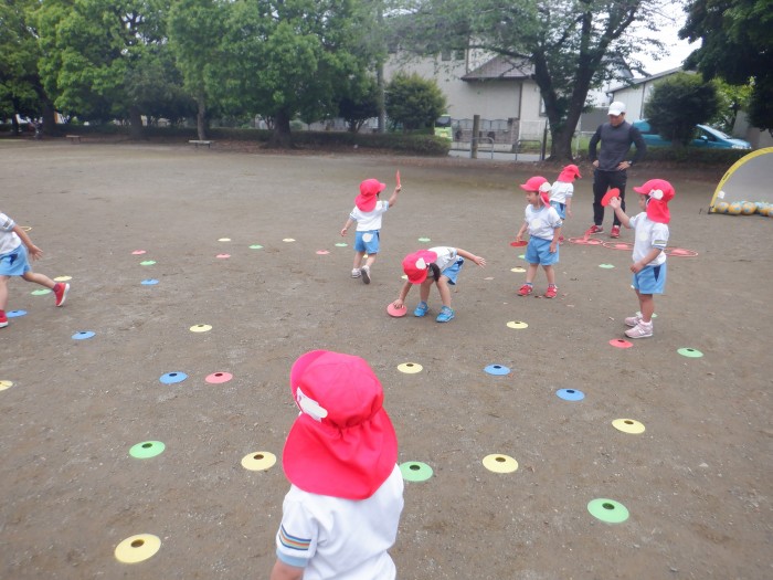 色を分けるゲームをしました。赤の輪っかにはカラーマーカーを置くのに1個ずつ頑張って置いていました。「見て持ってきたよ!」と笑顔が素敵でした☺️