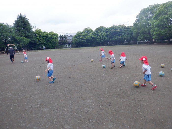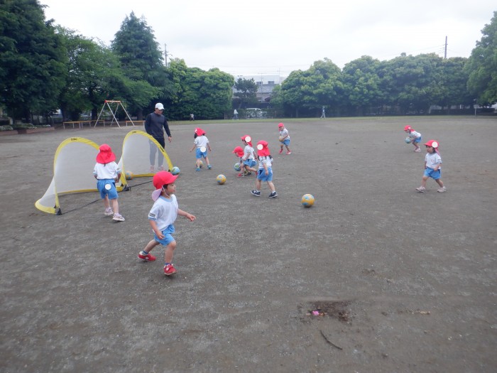 最後に、サッカーボールを蹴る練習をしました。蹴ったボールを一生懸命追いかける姿がとても可愛かったです。