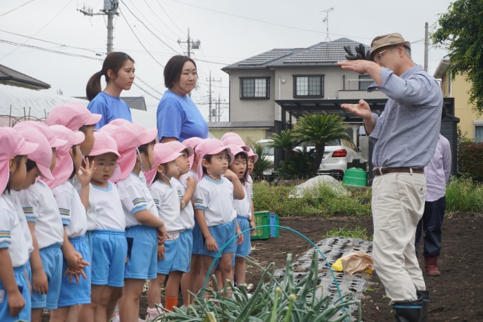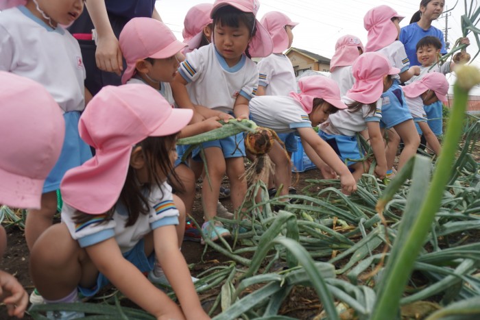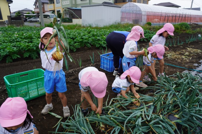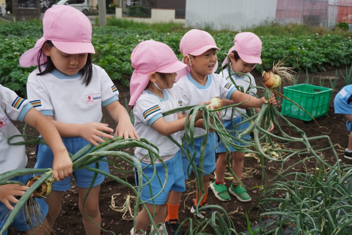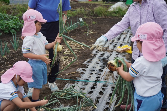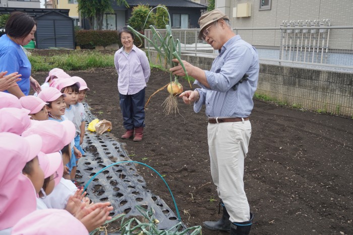理事長先生からたまねぎの抜き方を教わり、みんなでたまねぎの収穫をしました。
