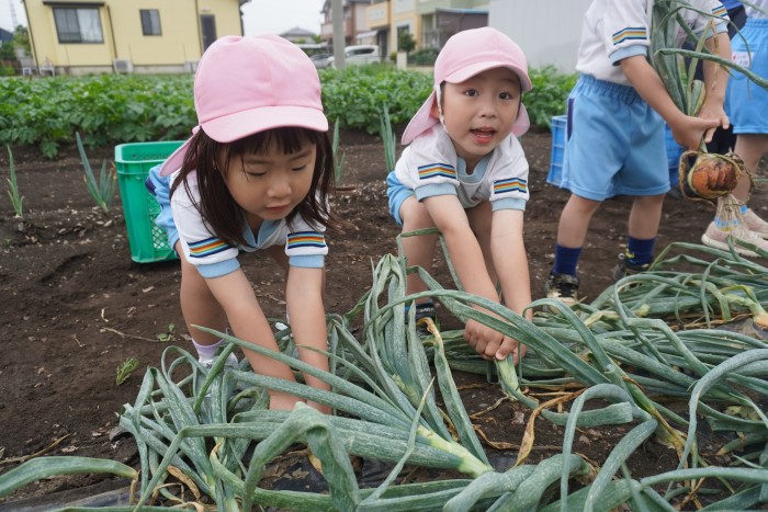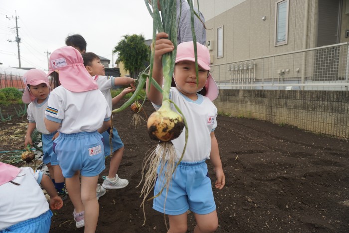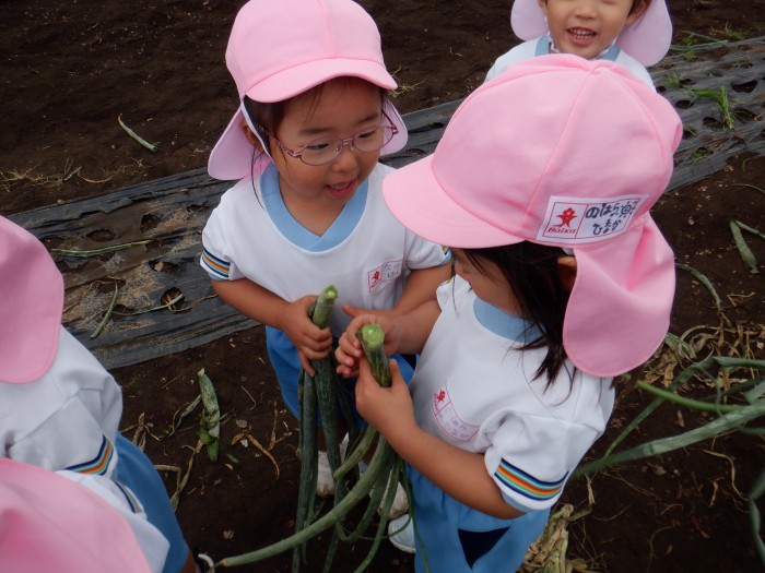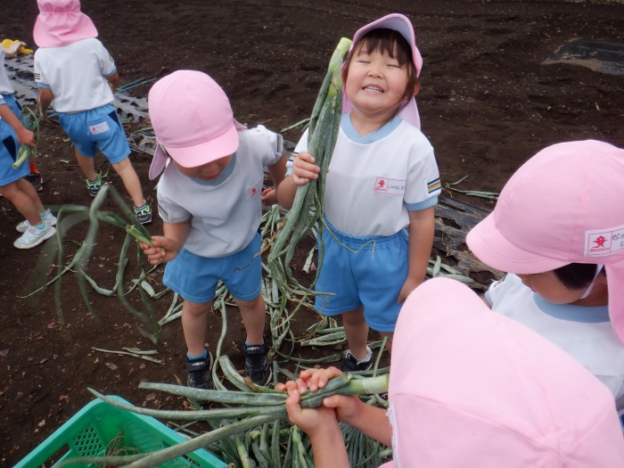 「これ大きくて全然抜けない!」「みんなで一緒に抜いてみよう!」と大きなたまねぎはお友達と力を合わせて抜いていました!