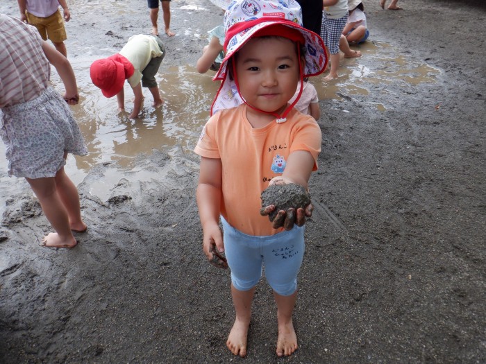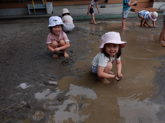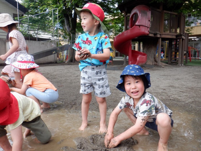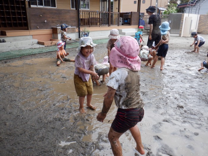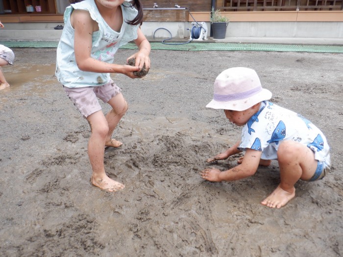 「お顔にどろが付かないように遊んでね」と伝えると、みんな身体を狙ってどろを投げたりお水をかけたりしていました!