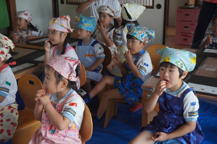 実際に色々な味を食べてみました!おせんべいやチョコレート、レモンなどを食べてみて、どんな味がするかみんなで当ててみました!どんな味がするのか難しくてなかなかわからない様子もありましたが、チョコレートを食べるとみんなすぐに「あまい!」と答えていました(^^)